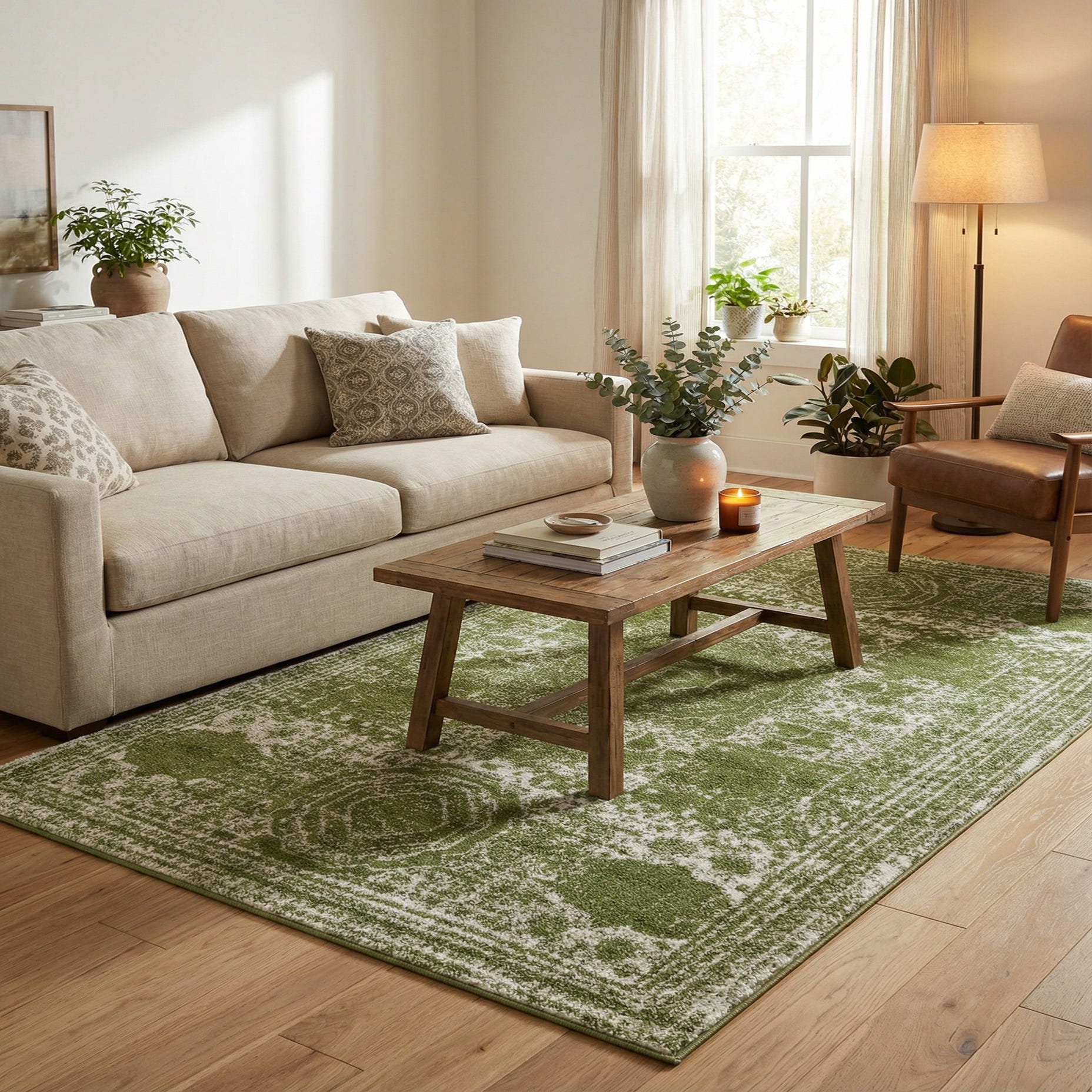 This piece works well as an anchor in a living room beneath a coffee table, layered in a bedroom to add warmth, or placed in an entry to introduce color and pattern. Pair it with warm woods, neutral linens and rattan for a relaxed, modern-farmhouse vibe, or combine with mid-century silhouettes and matte metal accents for a more tailored, transitional look. The green and ivory palette complements botanical, bohemian and coastal-inspired interiors when you want a grounded pop of color without heavy contrast.