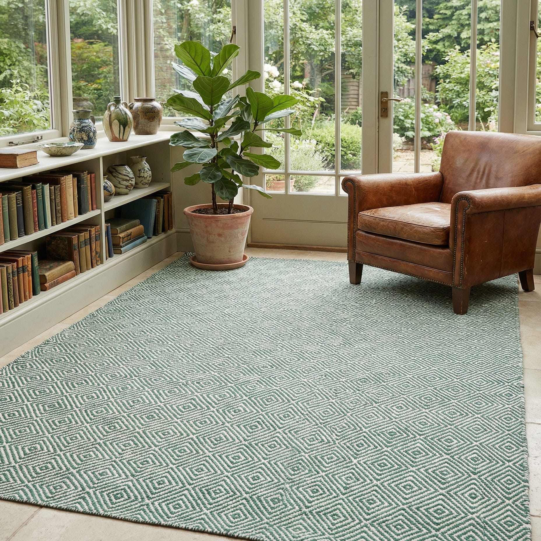 The Geo Trellis Flatweave rug presents a harmonious blend of functionality and style, handwoven using an 80% wool and 20% cotton blend for a combination of durability and soft texture. Measuring 5x8 feet, this rug features a geometric trellis pattern, delivering a sense of rhythm and interest to any room. The green and ivory colors interweave to create a versatile piece, with the green background providing both depth and a soothing backdrop to the crisp ivory lines.