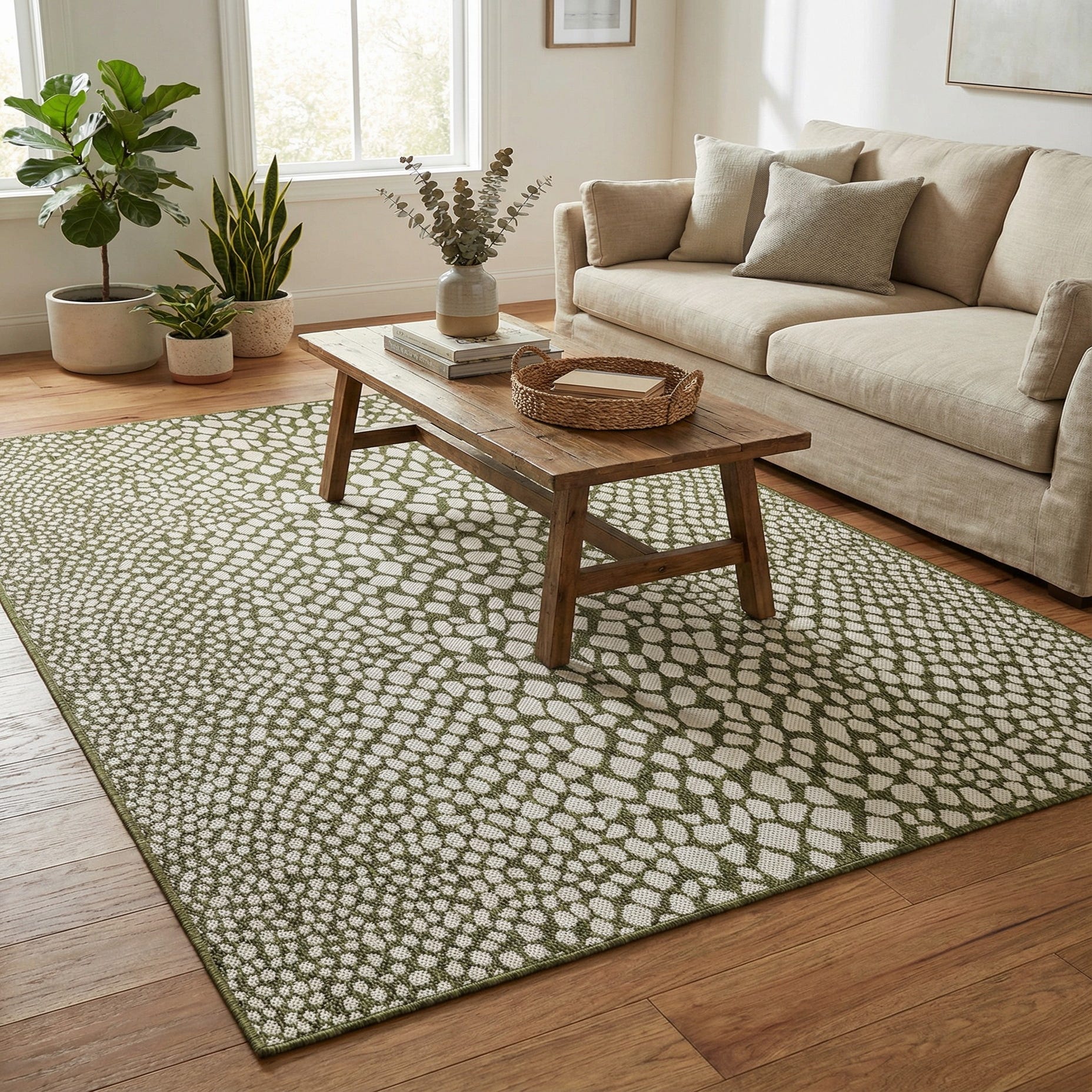 This piece brings a relaxed, contemporary feel to outdoor and indoor spaces alike. It pairs well with teak or wicker seating and natural-fiber accents on a covered patio, anchors a casual dining set in a sunroom, or adds an organic counterpoint to clean-lined, modern interiors. The green-and-ivory palette complements neutral linens, rattan, and wood tones while providing enough pattern to act as a focal point in minimalist or transitional schemes.