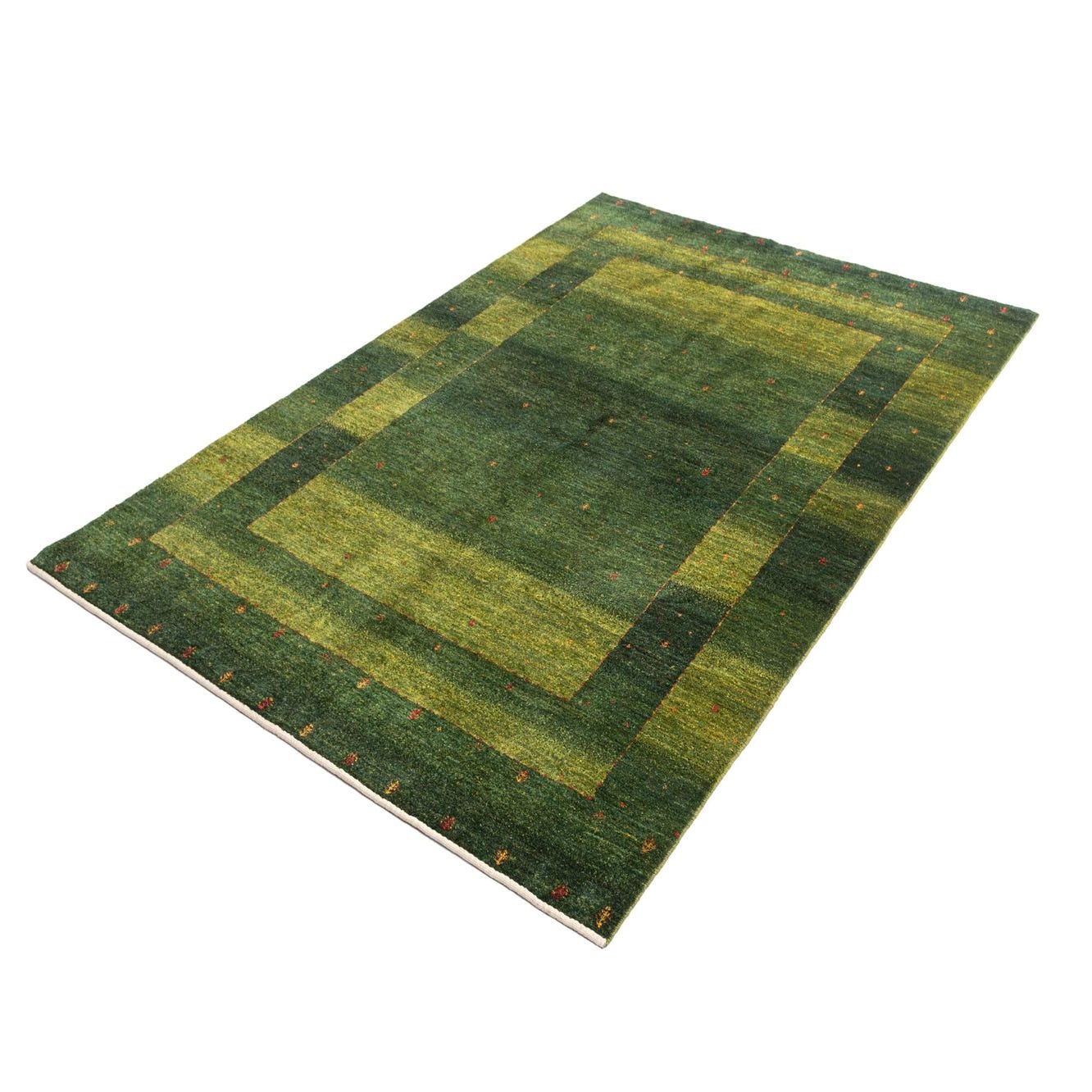 A rectangular 5x8 Kashkuli Persian rug in varying shades of green with a lighter green border and subtle red accents.
