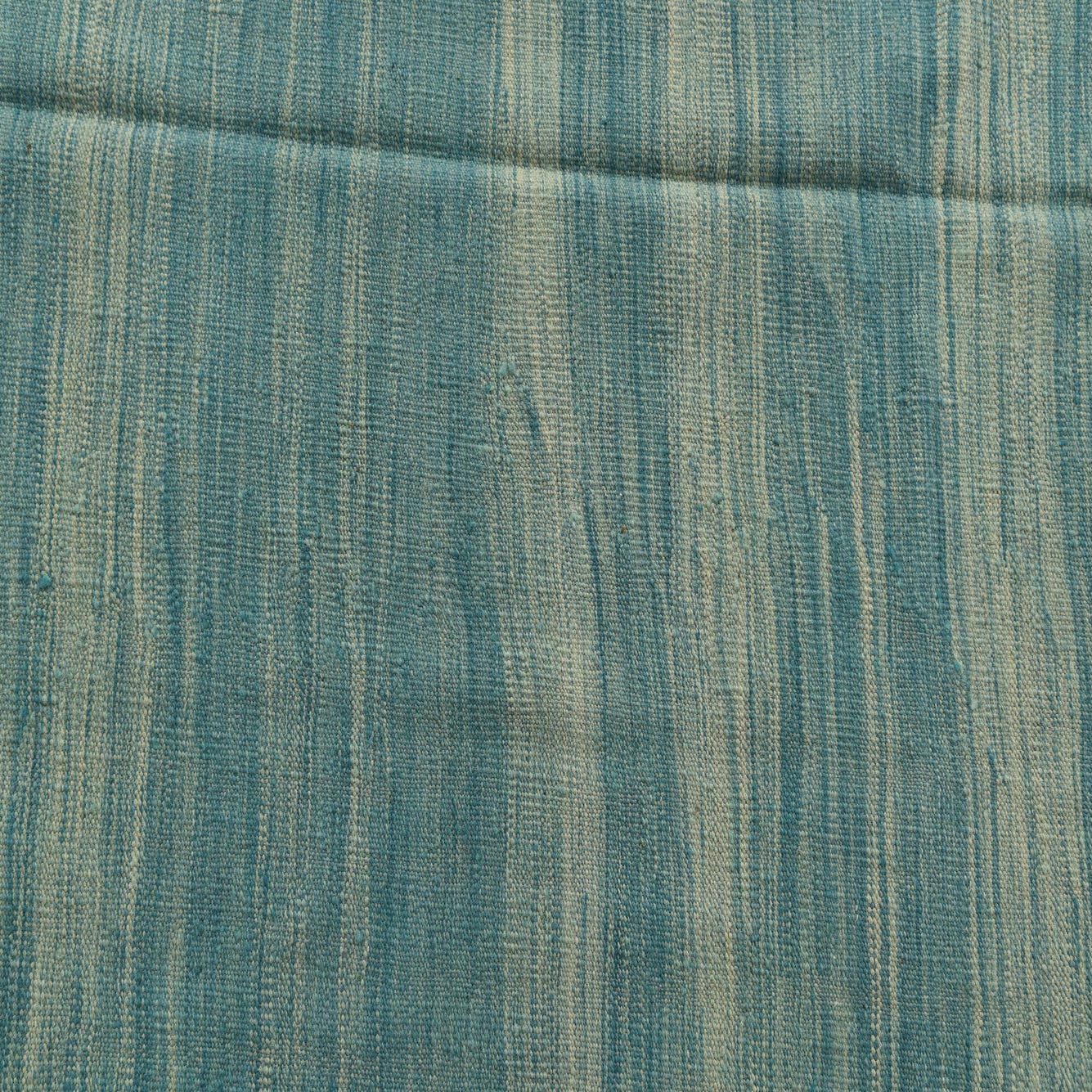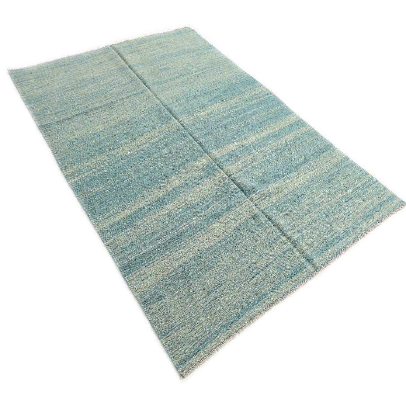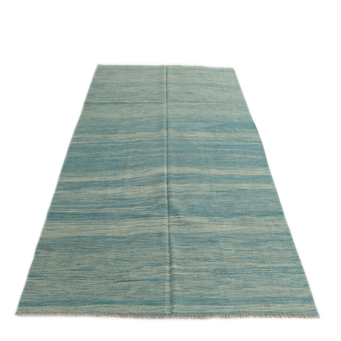 This Kilim Modern collection rug showcases a minimalist, variegated pattern with a sophisticated blend of green and beige hues. The background color is a soft green that echoes tranquility and versatility within any interior space. Hand-woven from 100% wool, this 5x8 rug offers a rich texture that is both comfortable and durable. Its simplistic design integrates subtle linear details that add a hint of depth to its overall appearance. Finished with fringe along the shorter edges, it adds a classic touch to this modern piece.