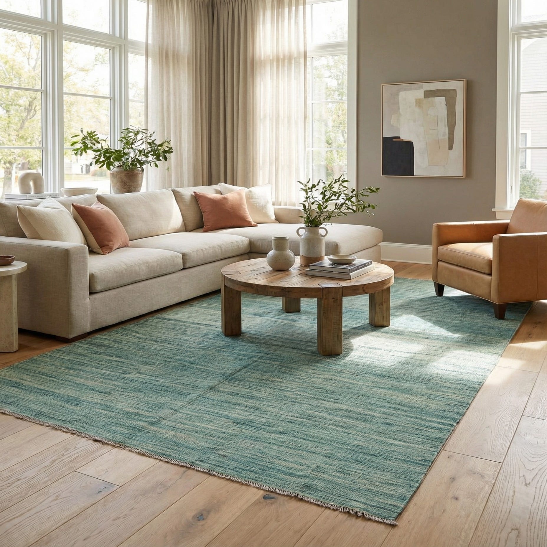 This rug works well in calm, relaxed spaces where texture and tone are the focus: place it beneath a low-profile sofa in a living room, layer it under a natural-wood dining table for an unfussy dining area, or use it to ground a bedroom seating nook. It pairs especially well with light oak or rattan furnishings, linen upholstery, and brass or aged-metal accents, and complements interiors leaning Scandinavian, coastal, or modern farmhouse.