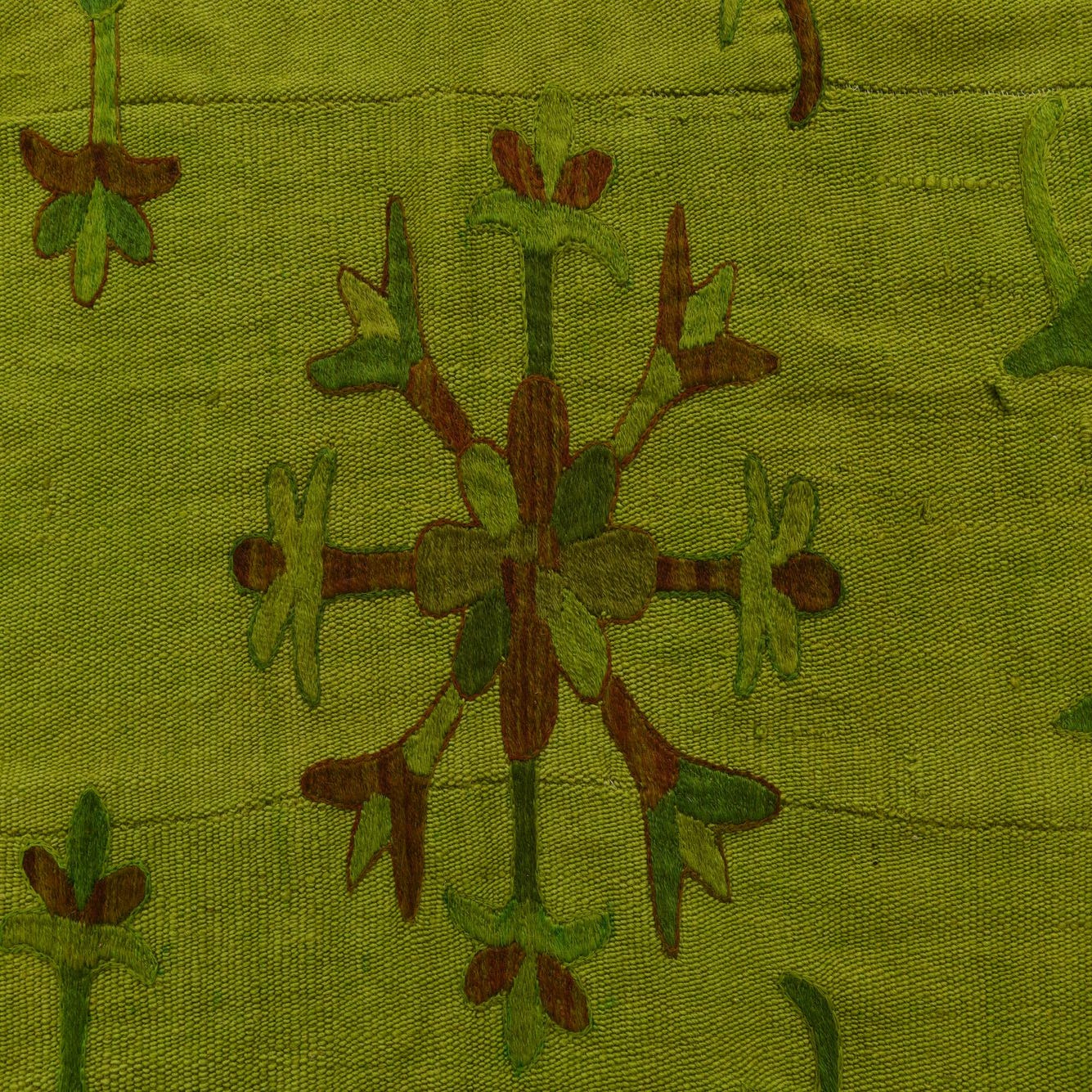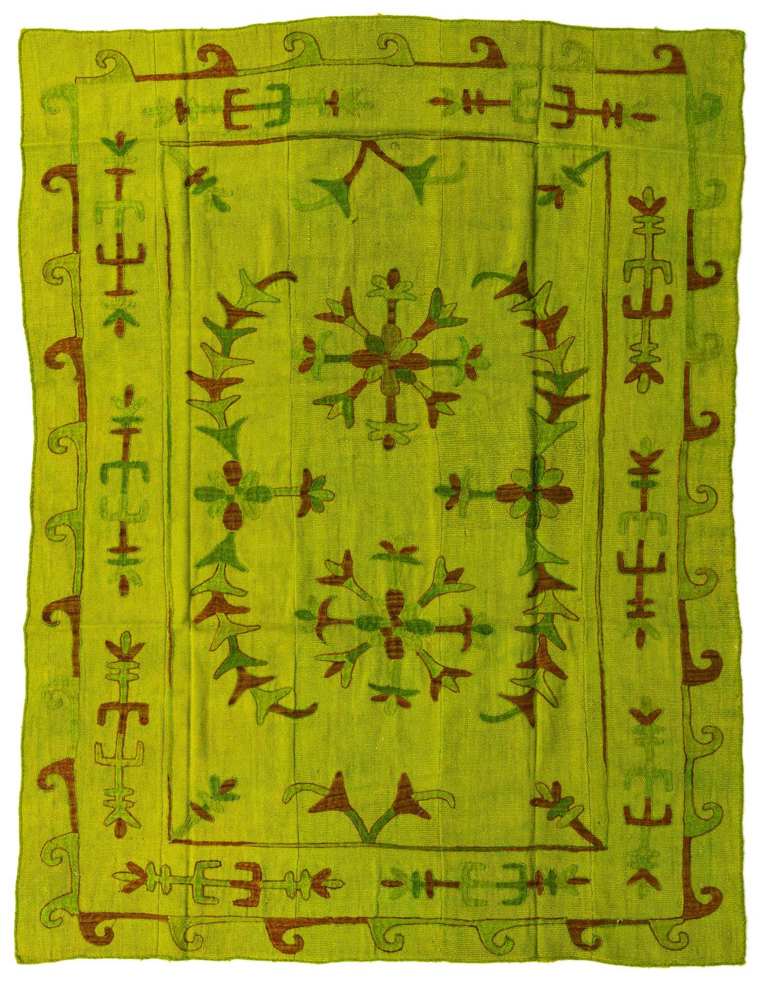 The Kilim Suzani rug is a handwoven piece that showcases the timeless elegance of traditional craftsmanship. This 5x8 rug is made of 100% wool, offering both durability and a soft texture that is comfortable underfoot. The rug features a vibrant green background complemented by brown accents in its detailed pattern. Its design is reminiscent of folk art, with stylized floral and botanical motifs spread elegantly across the field, framed by a simple, yet striking, border that enhances its visual appeal.