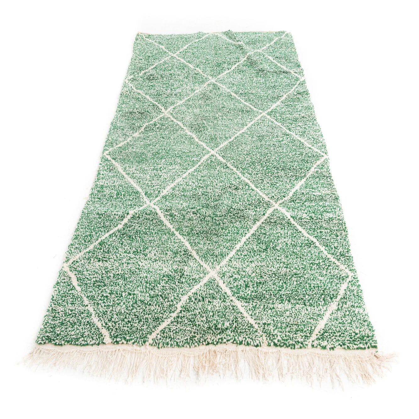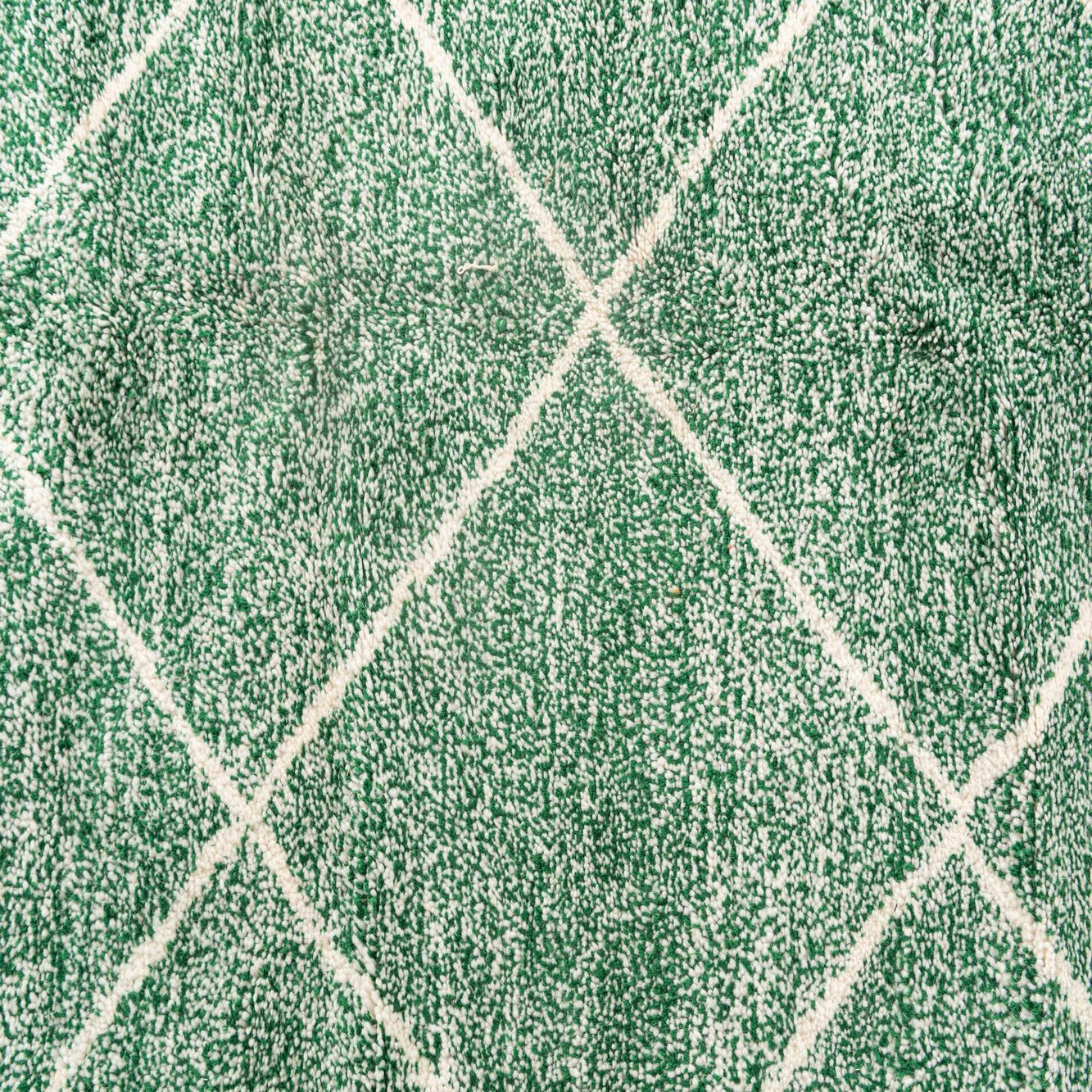 This Moroccan collection rug is a hand-knotted piece, meticulously crafted from 100% wool, imbued with a sense of history as it is semi-antique, dating back 40 to 60 years. The rug measures 5x8 feet, offering a substantial area for a variety of living spaces. It boasts a robust green background contrasted by an ivory diamond pattern, which provides a bold yet timeless appeal. The texture is indicative of the high-quality wool used, providing both durability and comfort underfoot.