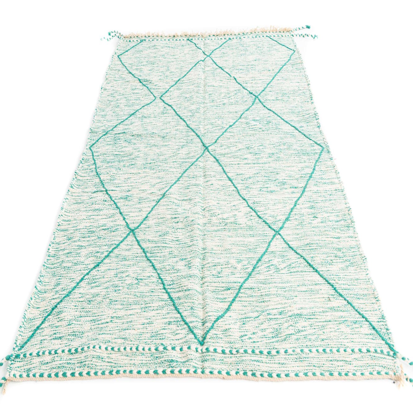 A 5x8 rectangular green and off-white Moroccan shag rug with a bold tribal diamond pattern.