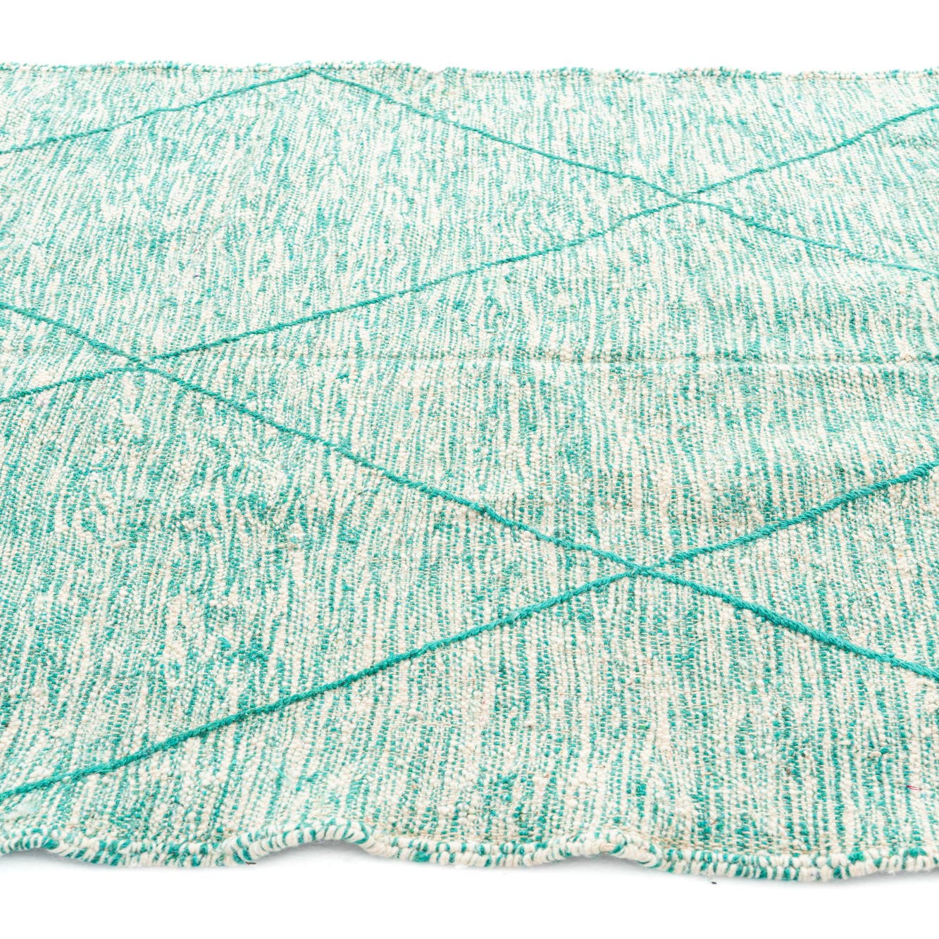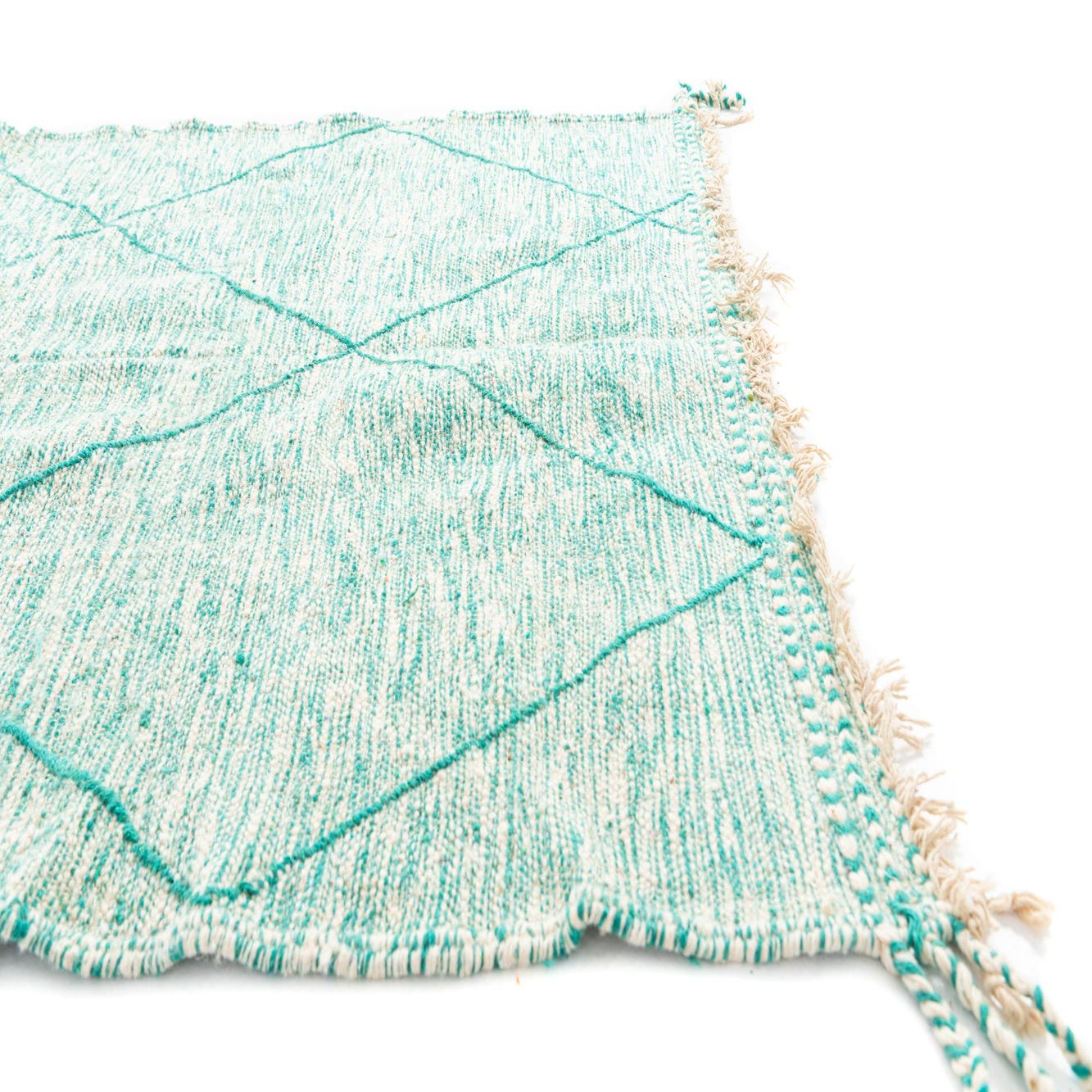 A 5x8 rectangular green and off-white Moroccan shag rug with a diamond tribal pattern, handmade from wool.