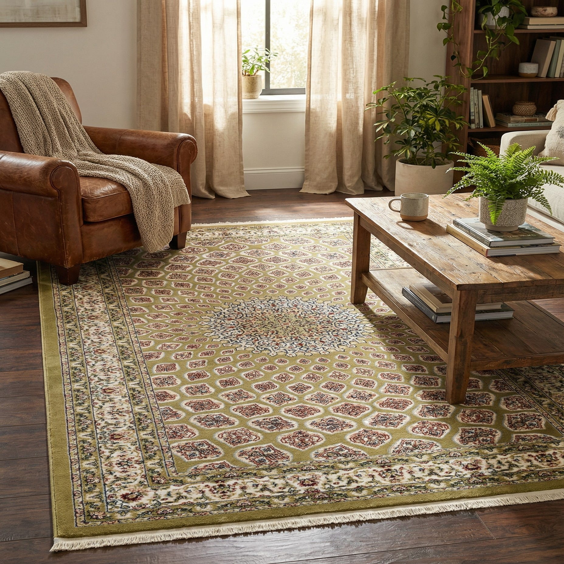 This piece fits well in traditional and transitional interiors—place it beneath a seating group in a living room to ground upholstered furniture, use it in a dining room to add pattern under a table, or layer it in a study to introduce color and formality. It pairs nicely with warm wood tones, navy or cream upholstery, and brass or antique-finished accents for a composed, collected feel.