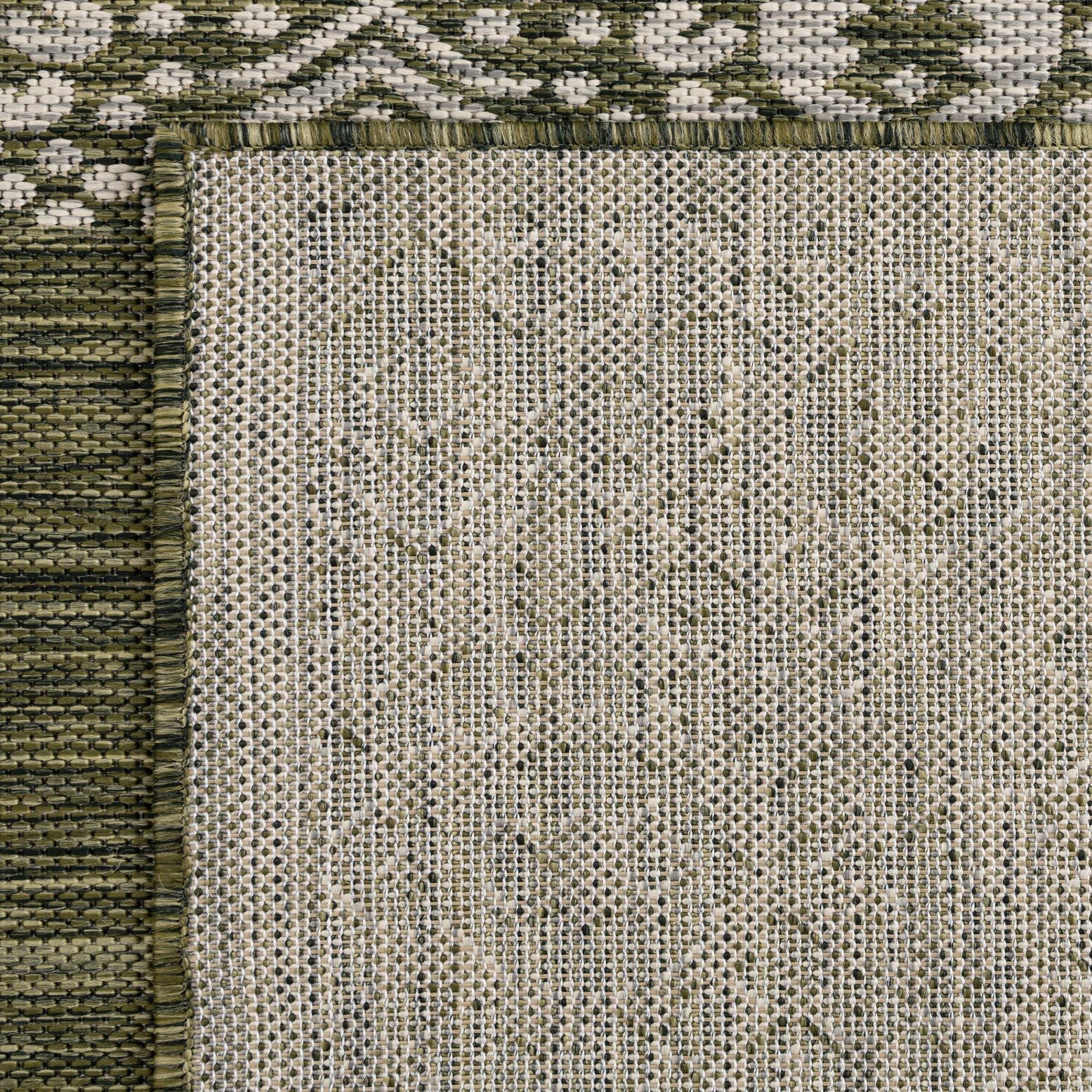 A 5x8 rectangular green indoor/outdoor rug with a solid center and a light-colored vintage-inspired border pattern.