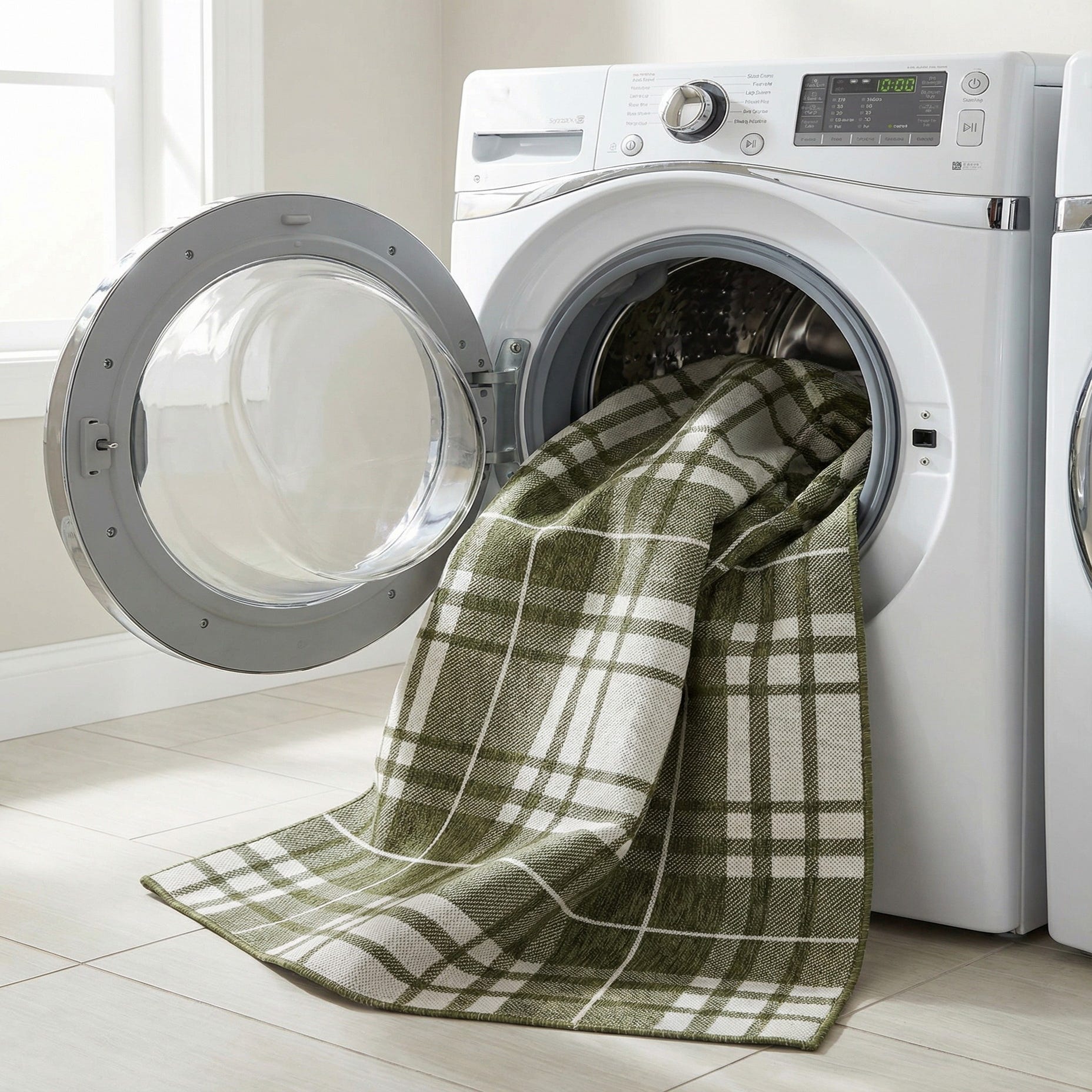 A 5x8 rectangular green and white modern plaid rug, suitable for indoor or outdoor use.