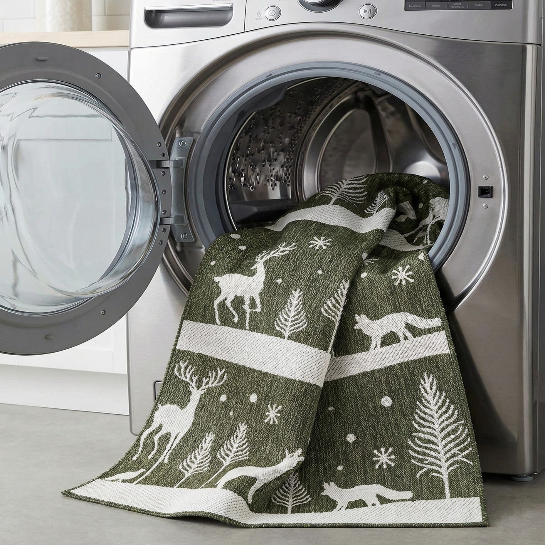 The Outdoor Holiday Collection presents a charming 5x8 machine-woven rug crafted from 100% polypropylene, ensuring durability and easy maintenance. This rug features a festive pattern with silhouettes of reindeer, foxes, and trees interspersed with delicate snowflakes, all set against a lush green background. The ivory-colored motifs contrast beautifully with the green, lending a crisp and seasonal look to the design.