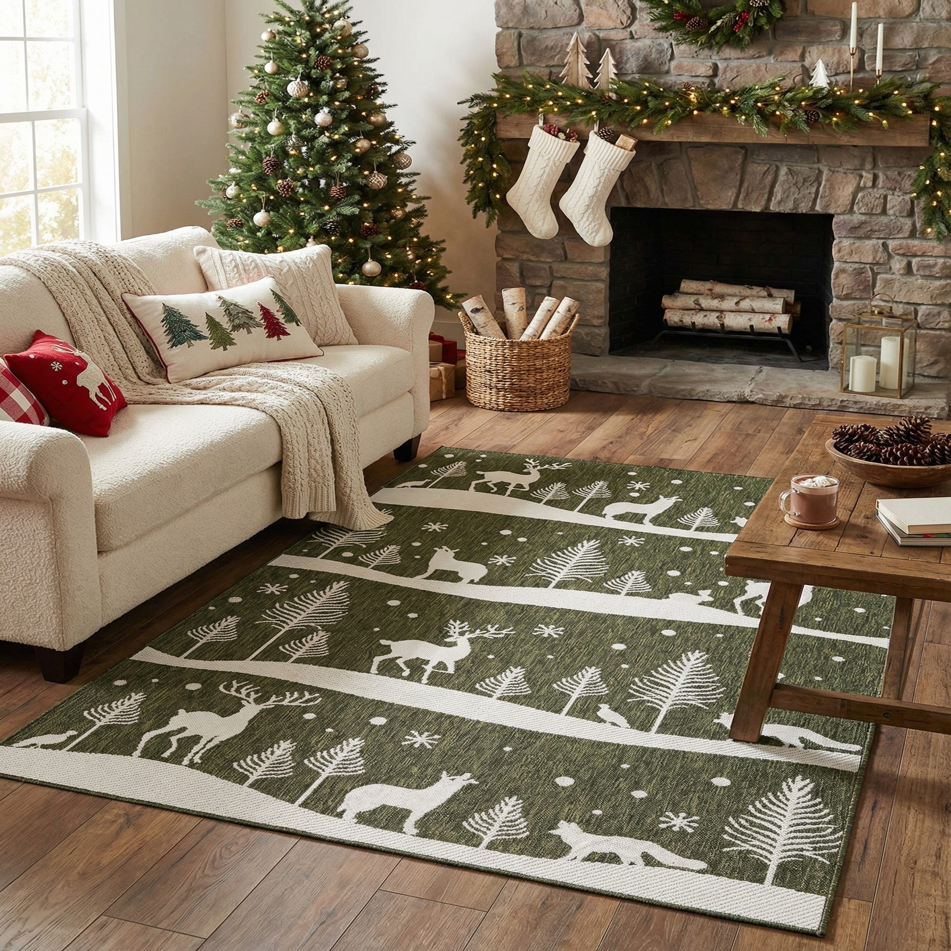 This rug's thematic pattern and color scheme are specifically suited for holiday decorating but could also work well in spaces with a nature-inspired, rustic, or cottage-style decor throughout the year. The simplicity of the design allows it to harmonize with a variety of color palettes and furniture styles, making it a versatile addition to any home looking to add a touch of seasonal charm.