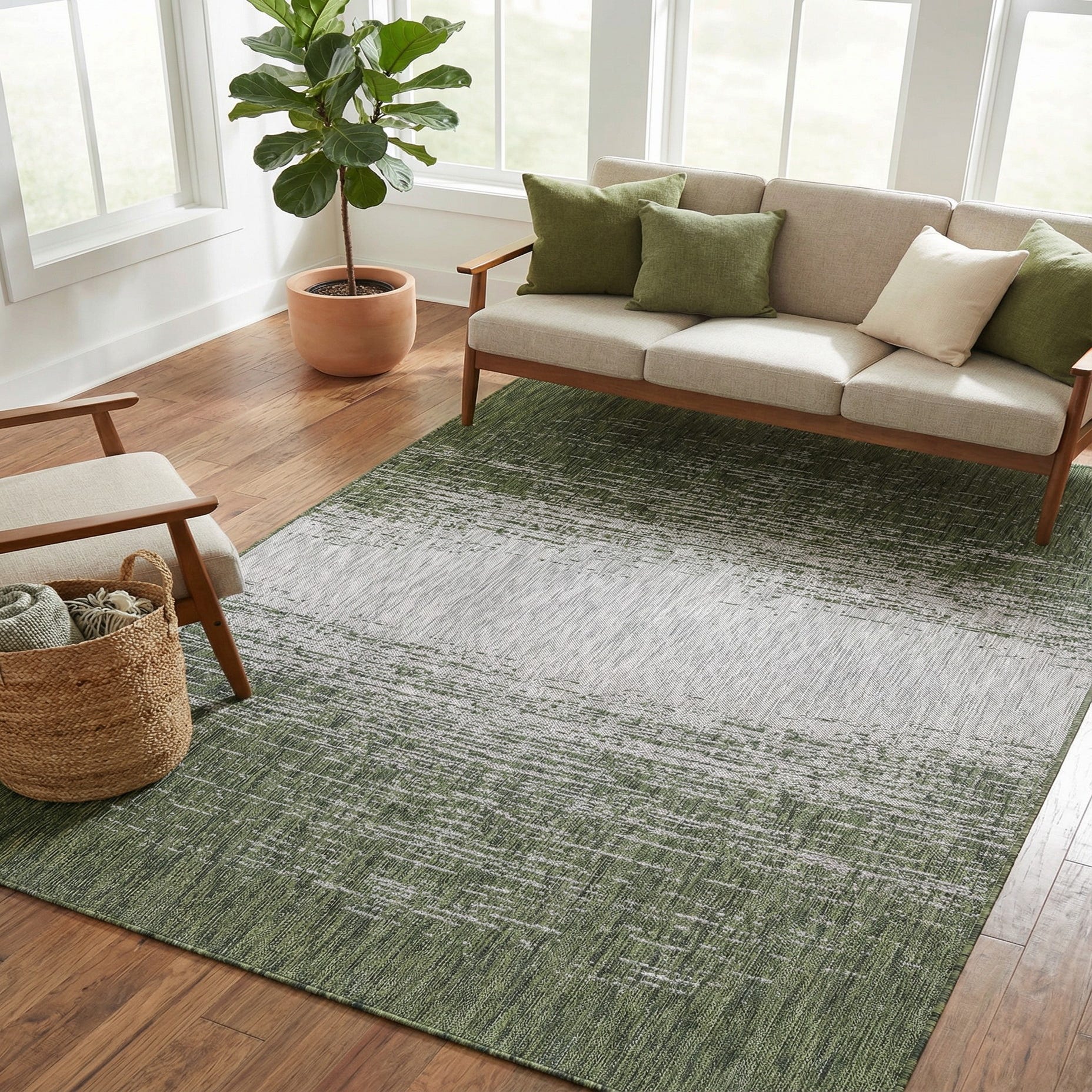 Machine-made from 100% polypropylene, the rug has a low-pile, flatweave feel with a slight ribbed texture that lays flat and feels firm underfoot. It works well in covered outdoor living areas, balconies, or high-traffic indoor spaces like entryways and dining rooms. Pair it with warm wood furnishings and neutral linens for a relaxed modern look, or combine with charcoal metal accents and plenty of greenery to emphasize the rug’s green and gray tones.