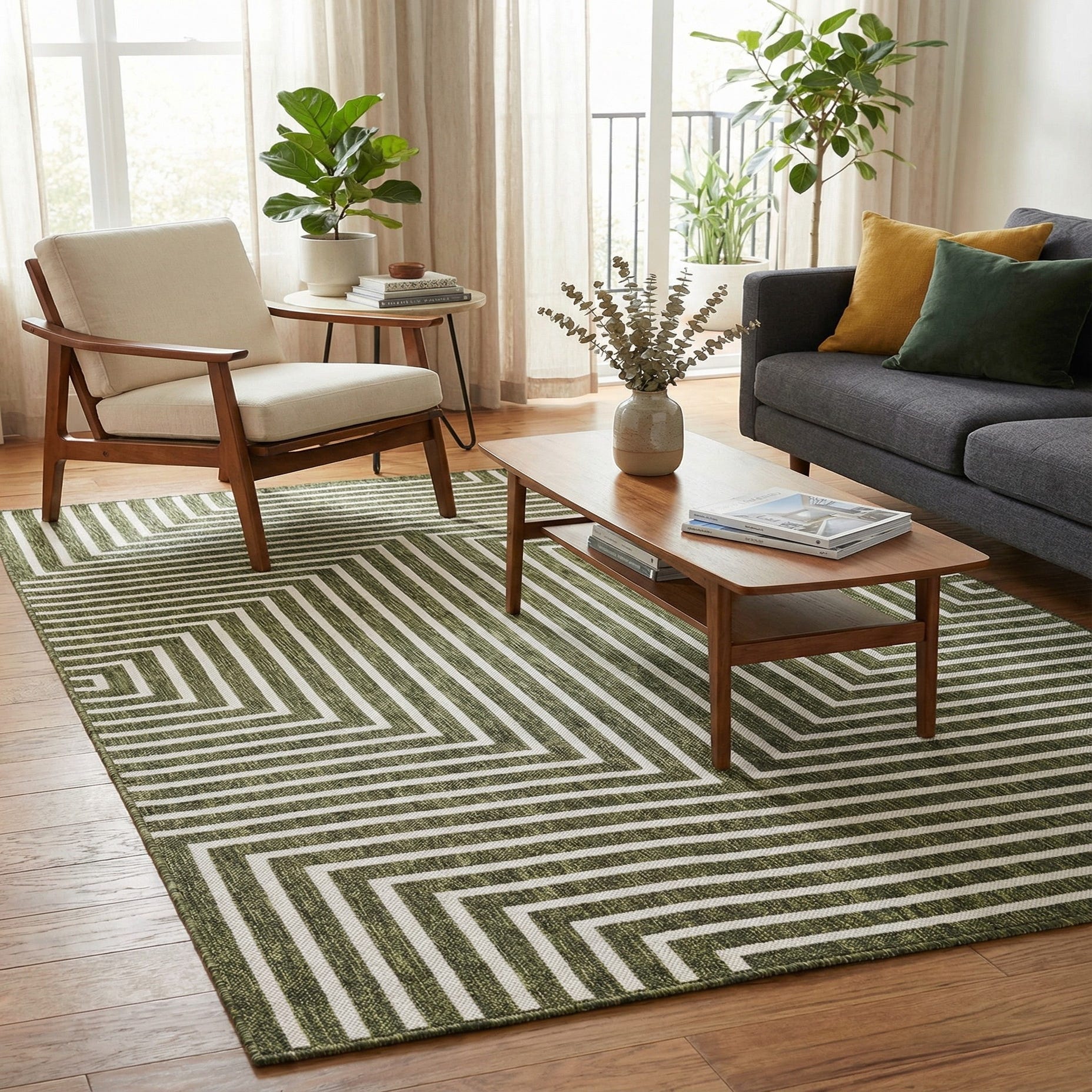 Machine made from 100% polypropylene, the rug has a low-profile, tightly woven flatweave with a slightly textured, ribbed hand that feels firm underfoot and wears well in higher-traffic settings. Place it on a covered patio or screened porch beneath casual dining seating, use it to anchor a modern living area with a simple sofa and metal coffee table, or layer it in a sunroom with plants and natural-wood furniture. It pairs nicely with warm teak, matte black or brass accents, and neutral or botanical textiles.