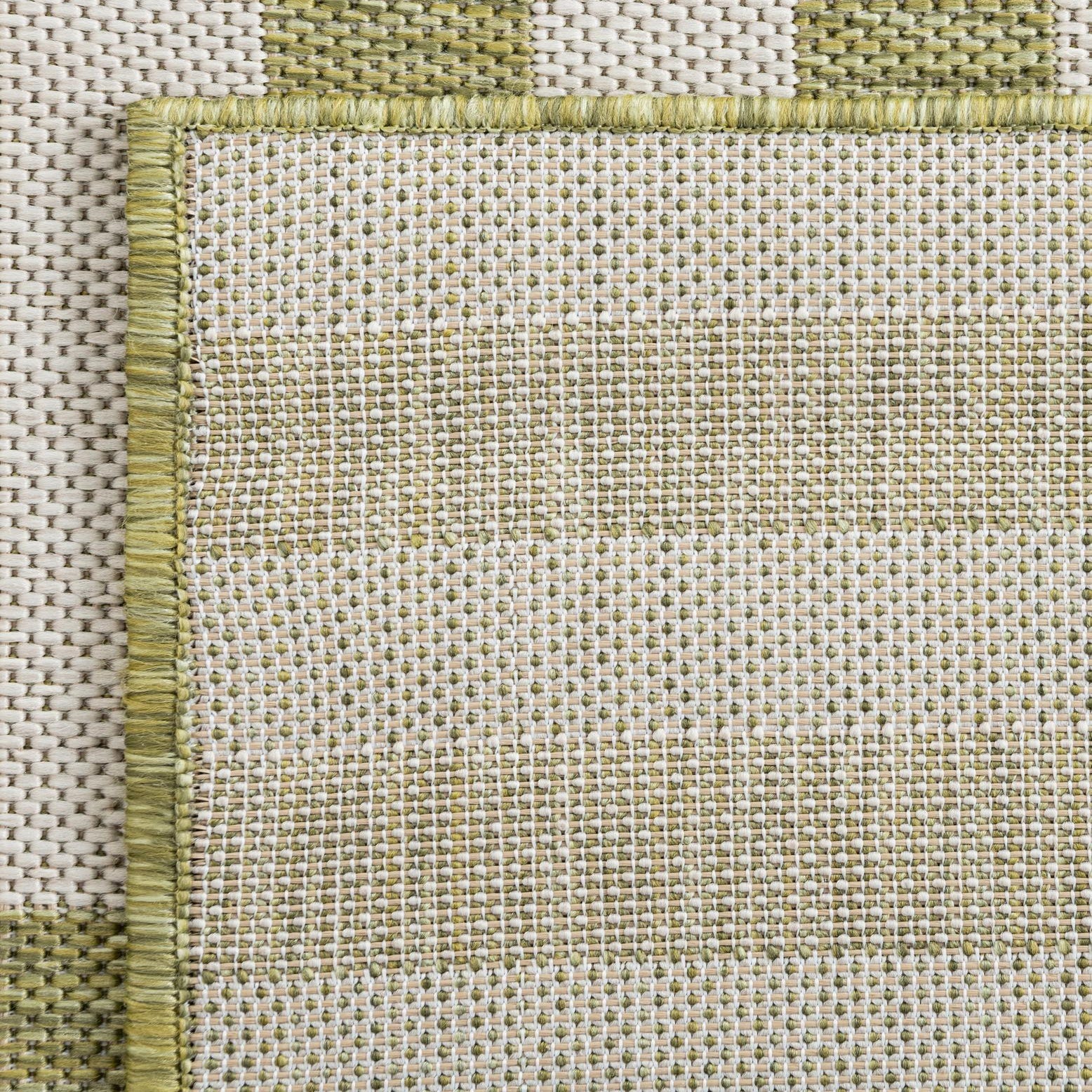 This rug's complementary green and ivory color scheme allows it to blend seamlessly into various design scenarios. It could serve as a complement to a minimalist outdoor setting, provide a pop of color in a neutral-themed room, or enhance a botanical-inspired space with its green hues. Whether placed on a poolside deck, in a sunroom, or under a patio dining set, this rug is designed to adapt to your outdoor living needs while maintaining a sense of style.