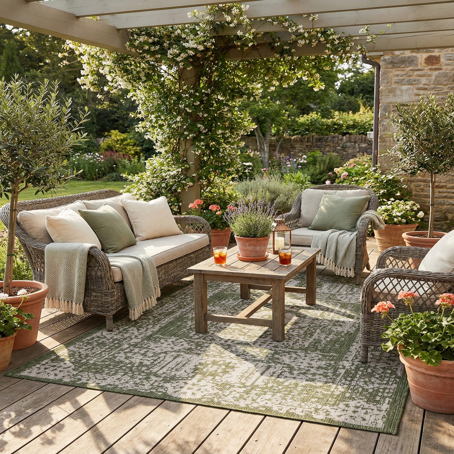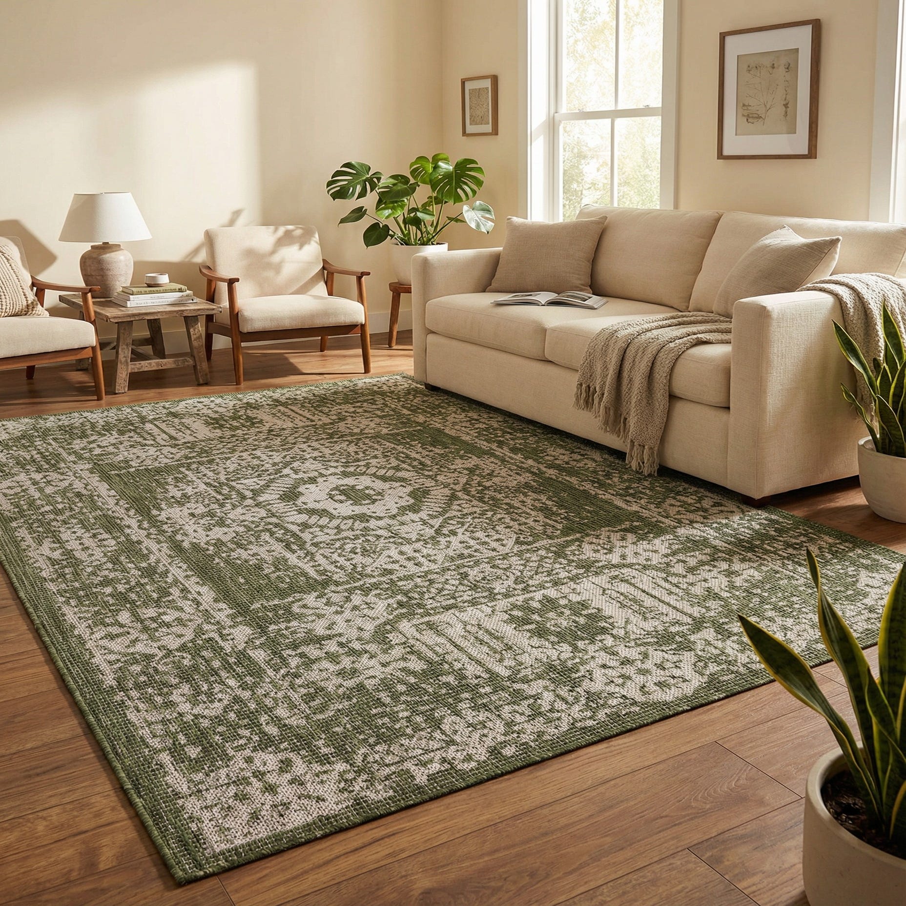 This rug works well on covered patios, sunrooms, or casual dining areas where durable construction and classic styling are desired. Pair it with natural wood or rattan seating and neutral cushions for a relaxed traditional feel, or combine it with gray upholstery and mixed-metal accents for a more contemporary approach that still references classic patterning.