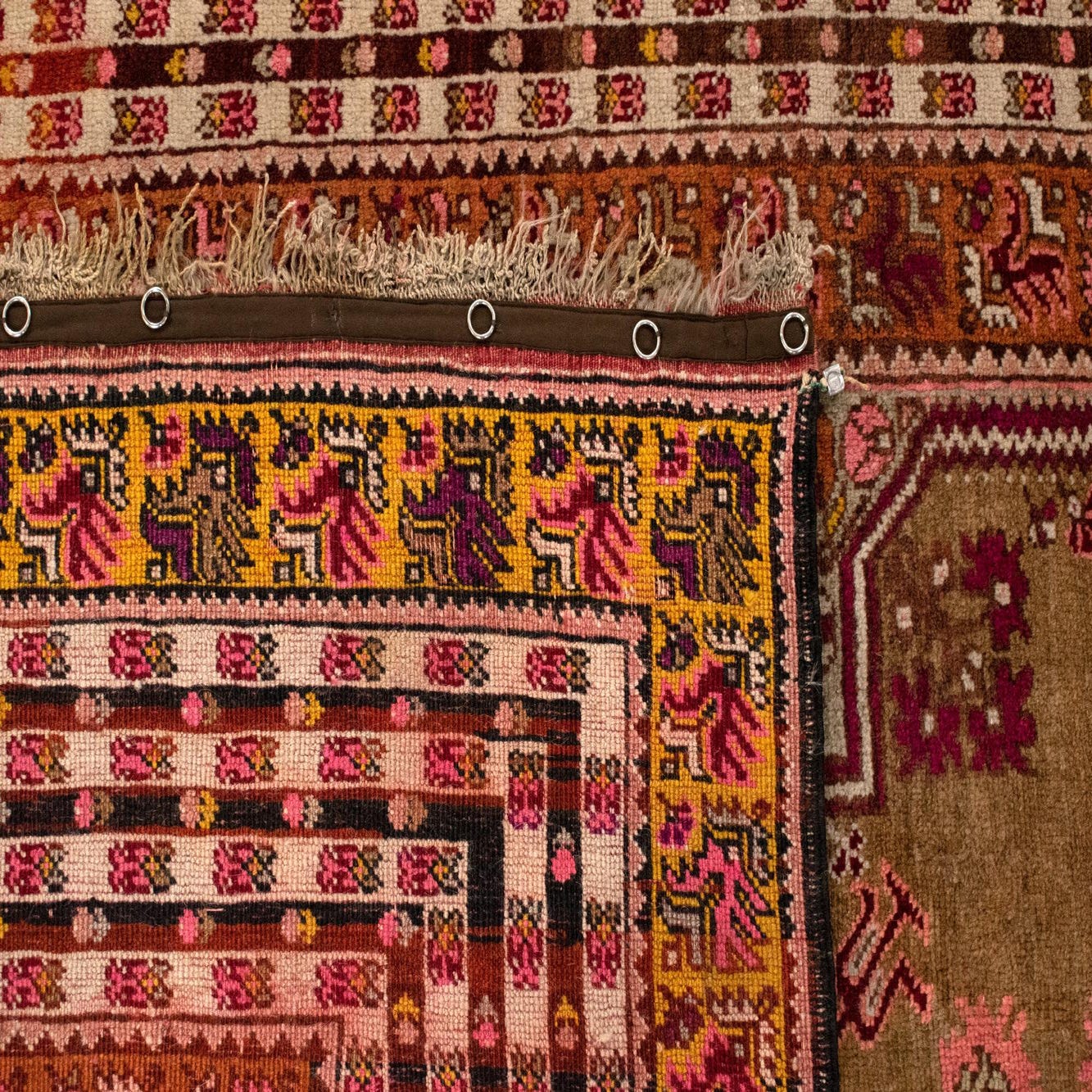 A rectangular 5x8 Taspinar rug featuring a central medallion and intricate floral patterns in shades of red, pink, and orange on a brown background, with a multi-bordered design.