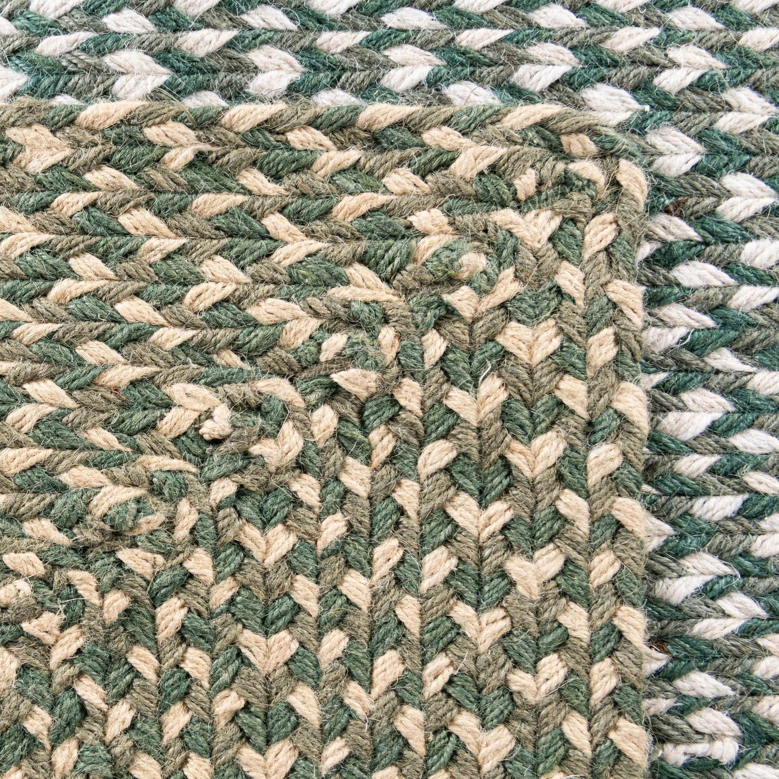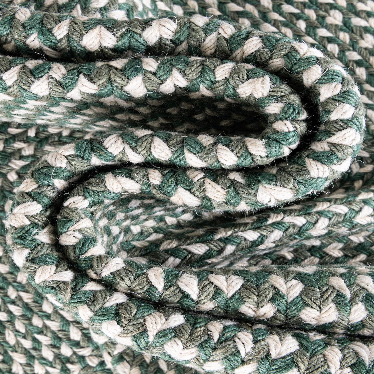 Hand-braided from 100% jute, this rug combines a tight tweed braid with a structured border that frames the field in neat concentric rows. The background is green, woven with ivory strands to create a subtle two-tone tweed effect that reads textured and natural. The surface has a firm, braided feel underfoot—textural and low-profile—so the woven pattern and border remain clearly defined.