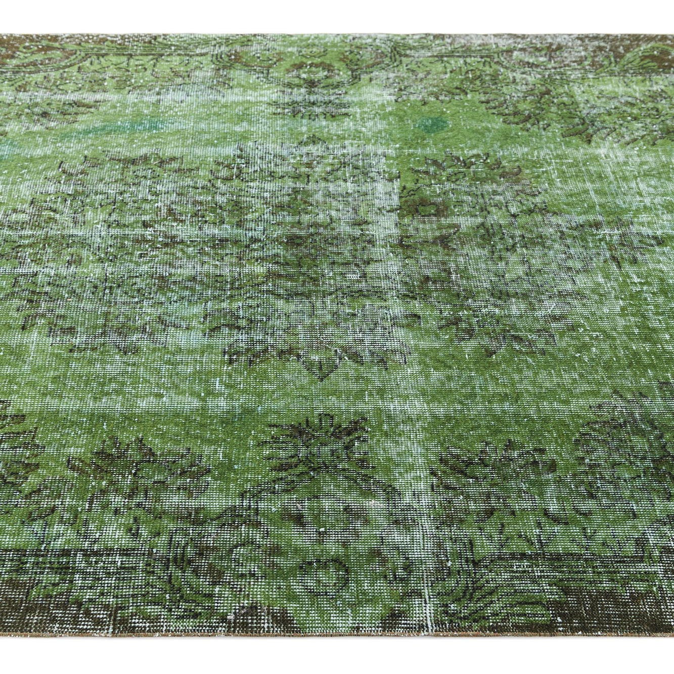 A 5x8 rectangular green wool rug with a distressed vintage Persian pattern, suitable for a living room.