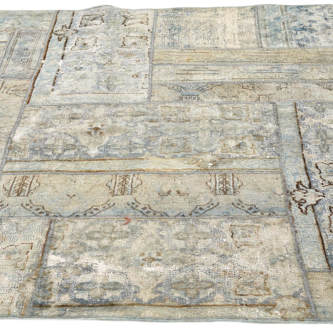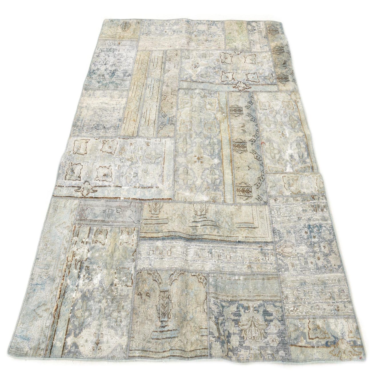 The rug's intricate patchwork design, combining traditional motifs with faded details, provides visual interest and a sense of history. The woolen texture ensures a soft, plush feel underfoot, making it not only a visual asset but also a comfortable addition to a home.