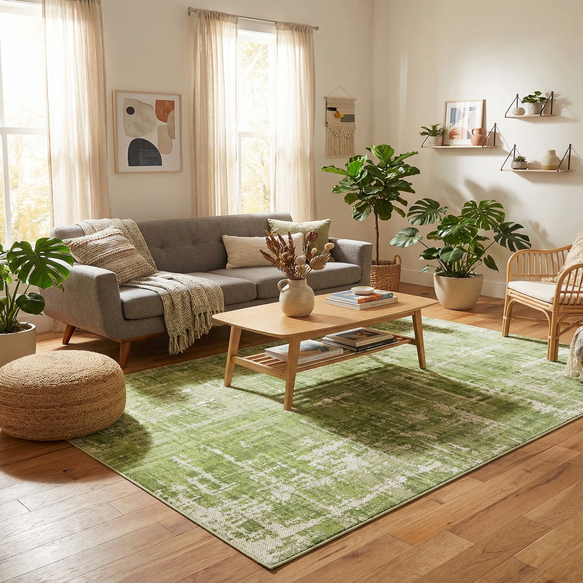 This piece works well in modern and transitional interiors: place it under a coffee table in a living room to anchor light upholstery, use it beneath a dining table with warm wood tones, or add it to a bedroom for a fresh, green accent. Pair with ivory textiles, natural woods, woven textures, and matte metal accents to balance the color and pattern. The polypropylene construction suits rooms with regular use, such as family rooms, home offices, or entryways.