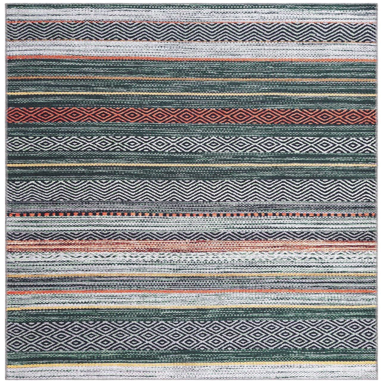 A banded, geometric look balances lively color with a structured repeat. The green background anchors alternating stripes of ivory, hunter and light greens, light blue and navy blue, with bright red accents woven into diamond and chevron motifs and narrow linear stripes. Machine-made in polyester and chenille, the surface combines smooth, tightly woven fields with softer chenille ribs that create a subtle, tactile contrast when you run your hand across it.