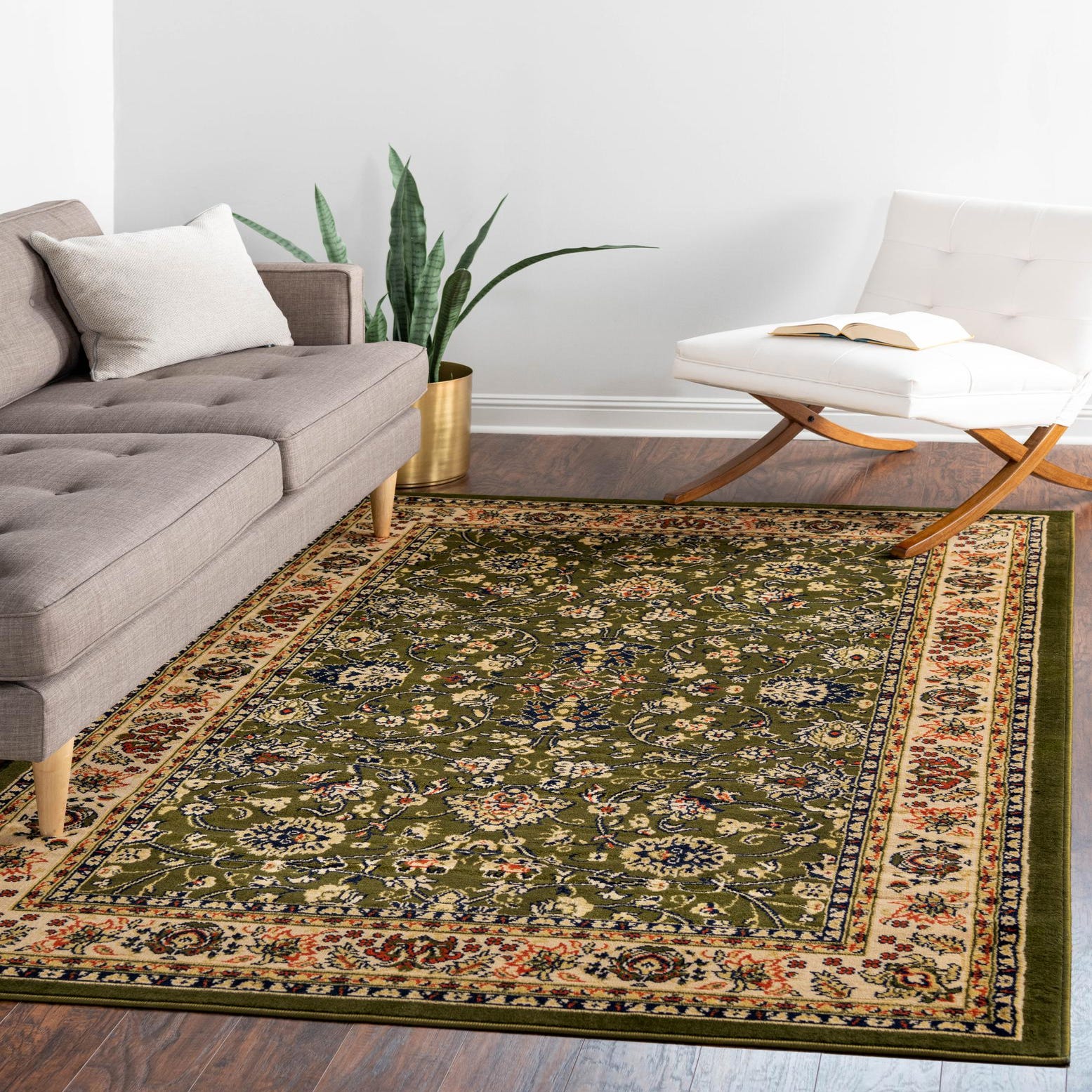 The Yasmin 5x8 area rug features a traditional design with a primary green background, adorned by an intricate pattern of florals and filigree in cream, terracotta, and navy blue. The symmetrical arrangement provides a sense of order and classic beauty, while the bold border frames the design with a harmonious color blend, complementing the central theme.
