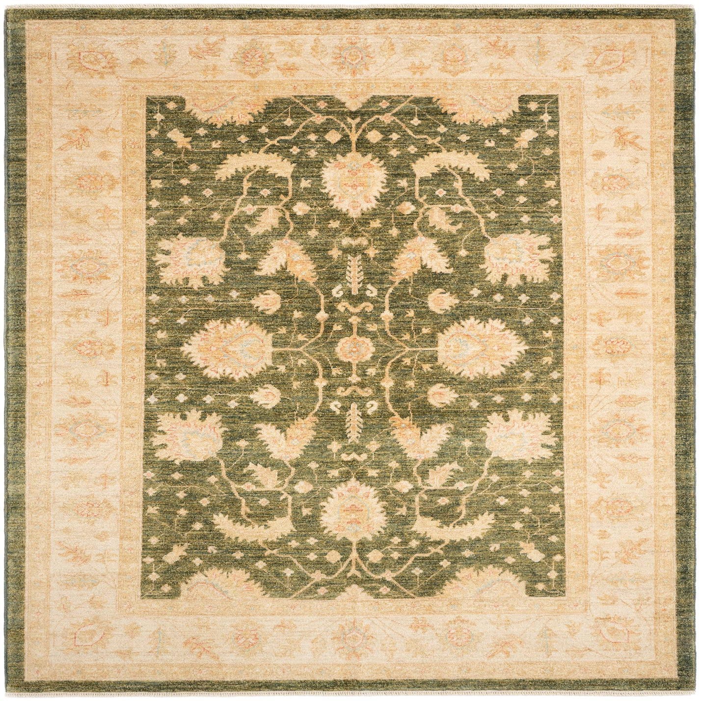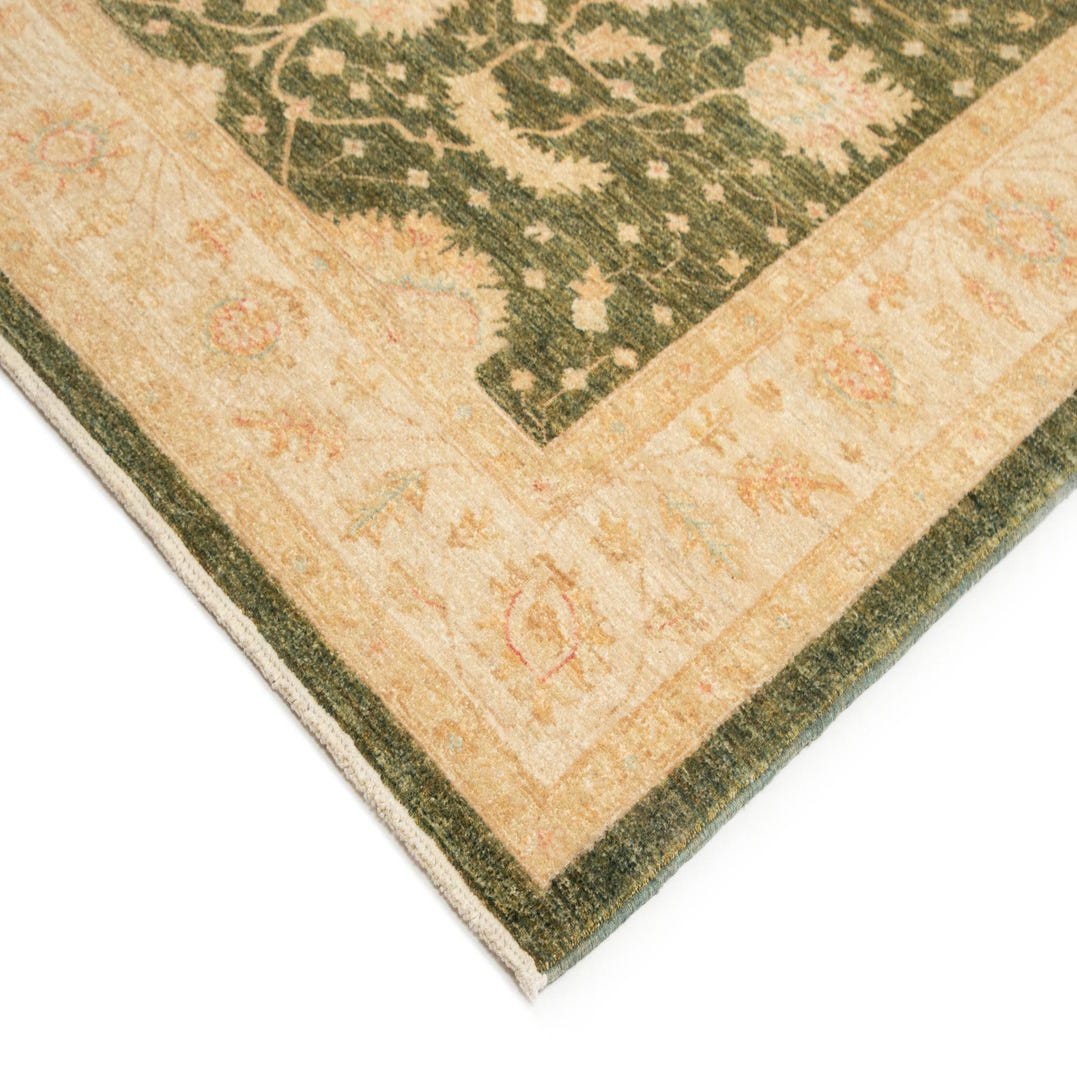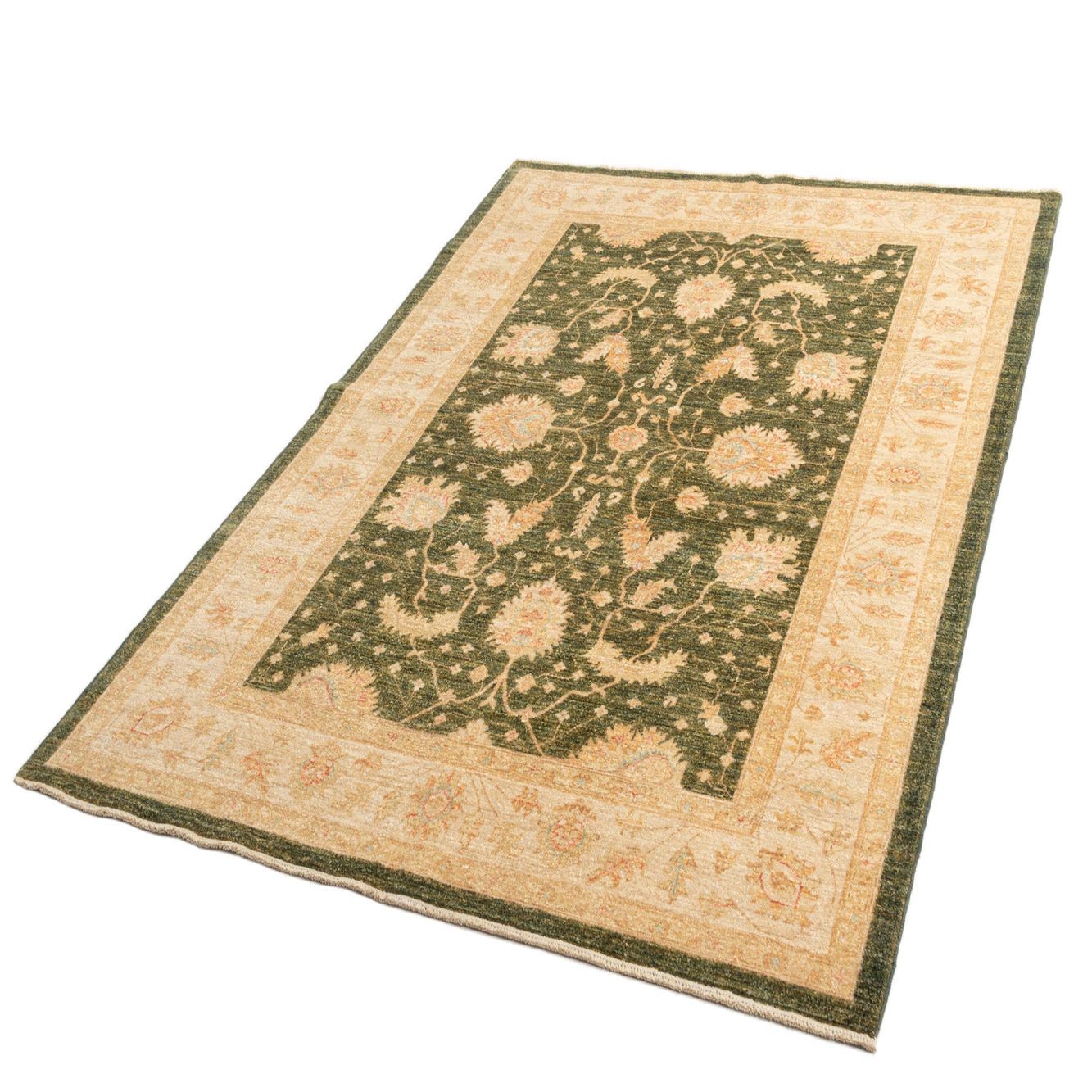A 5x8 rectangular Ziegler Persian rug in shades of green and cream, featuring an intricate floral pattern and a medium pile.