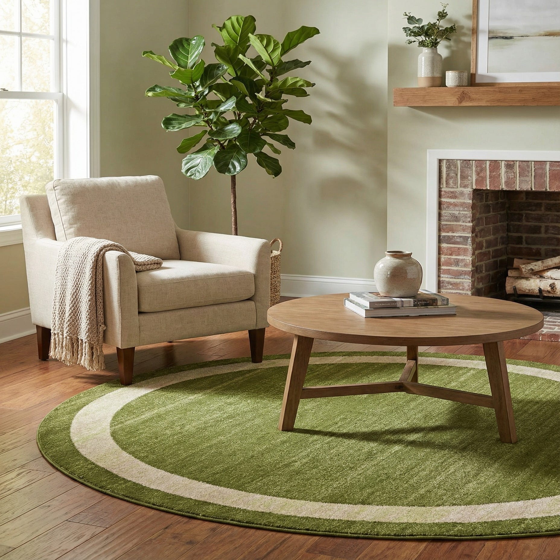 Use it to define a small dining nook or bistro area, anchor a cozy reading corner with an armchair and lamp, or place it in an entryway to introduce color and structure. Its green-and-ivory palette and restrained motif work well with mid-century, Scandinavian, or transitional interiors and can bring a fresh, grounded accent to neutral living rooms or home offices.