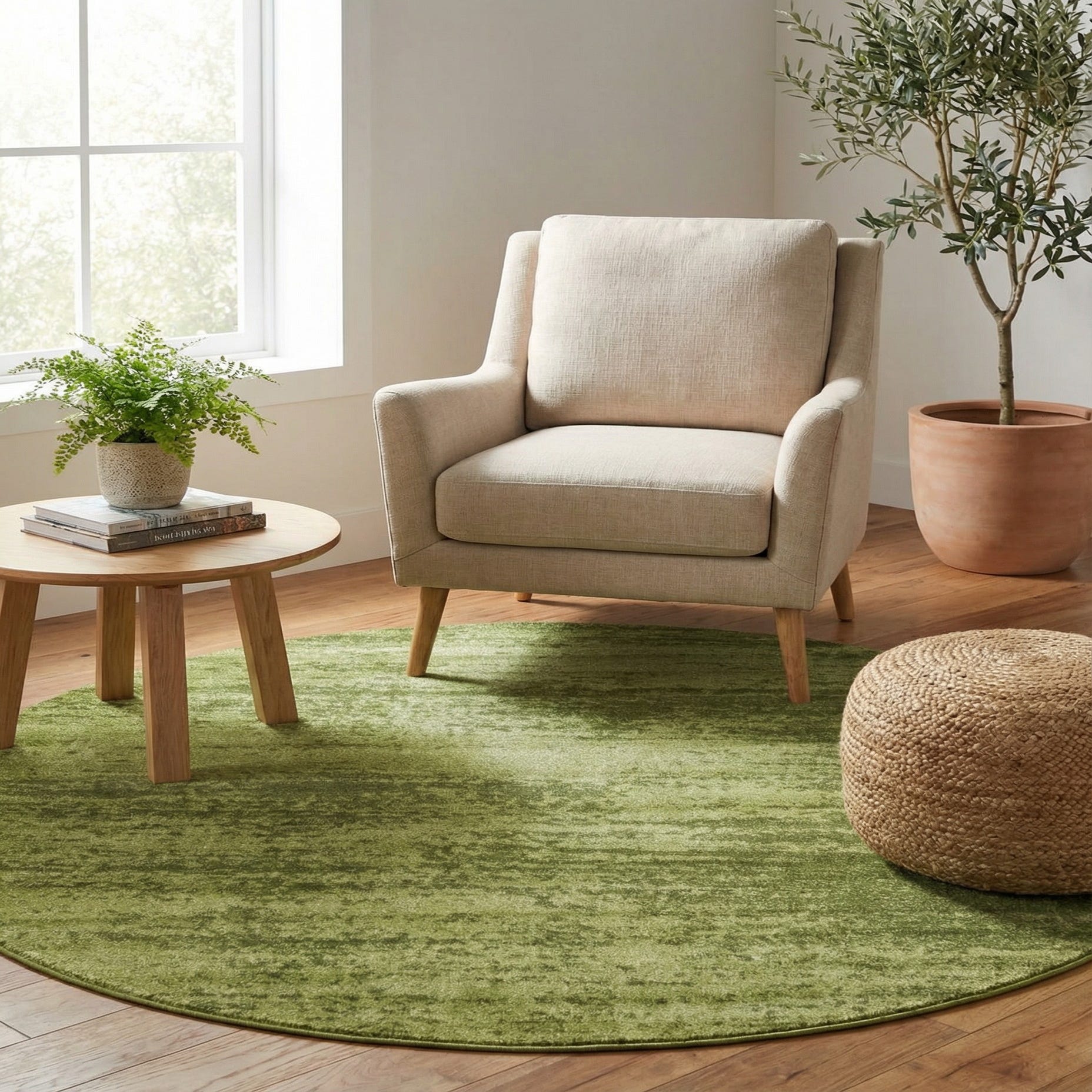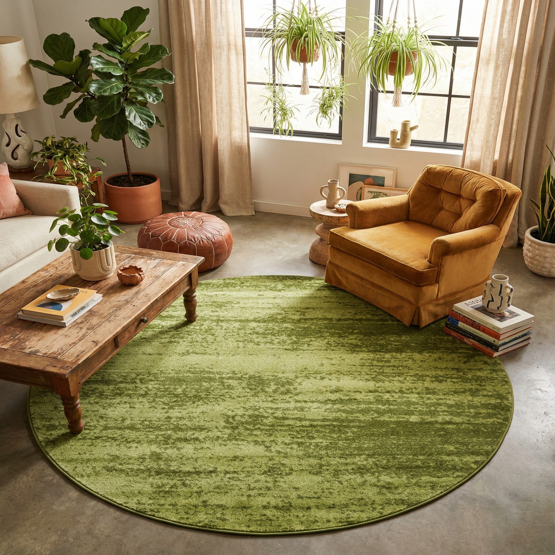 This rug is stain-resistant and shed-free, aligning with the practical needs of active living spaces. Given its round shape and calming color palette, this rug is well-suited for anchoring furniture in a seating area, adding a touch of warmth under a round dining table, or providing a welcoming accent in an entryway. It can effortlessly complement a nature-inspired decor theme, harmonize with a minimalist aesthetic, or serve as a grounding element in a color-blocked interior design strategy.