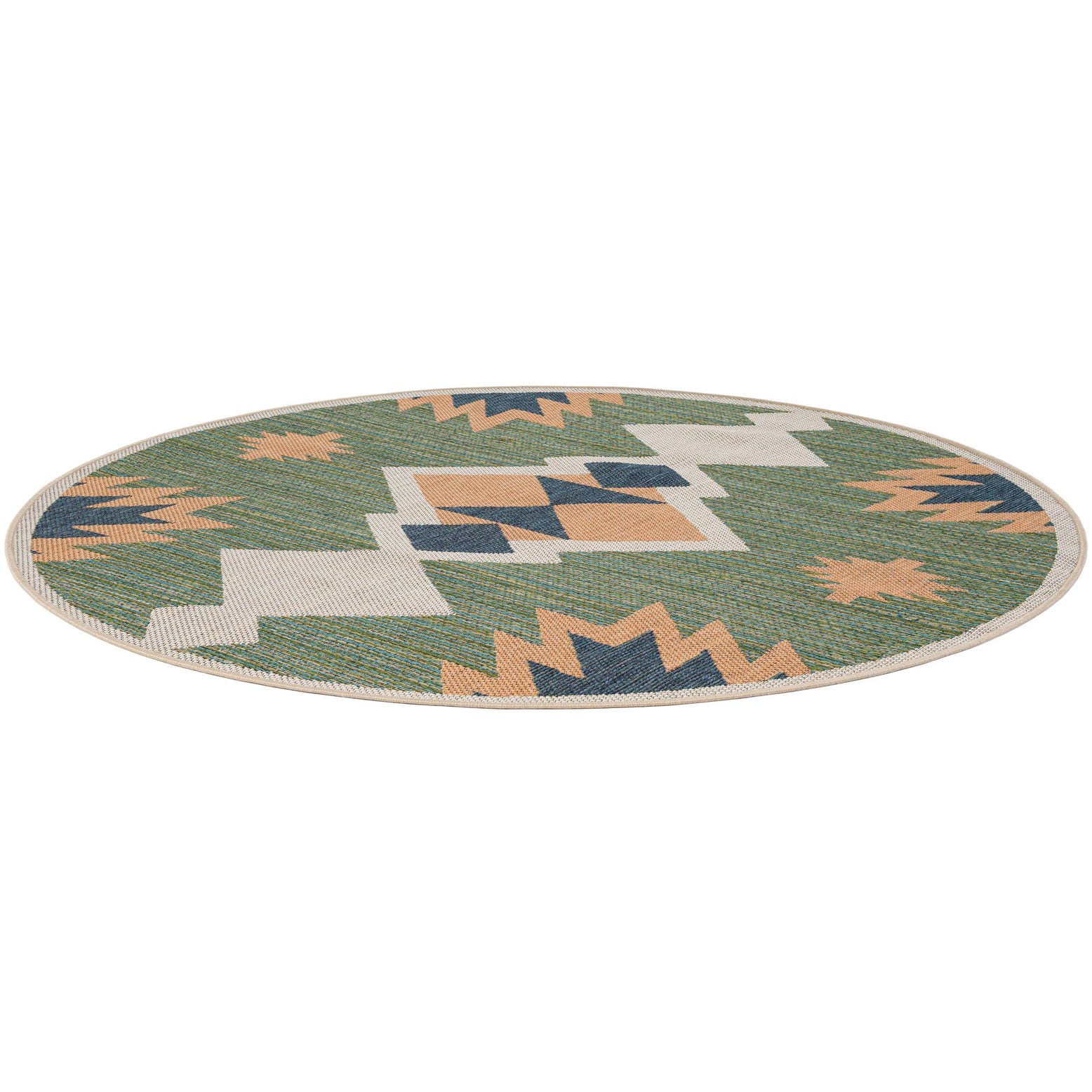 A 6' round Baja Outdoor rug featuring a green, tan, and blue Southwestern tribal pattern with a central medallion.
