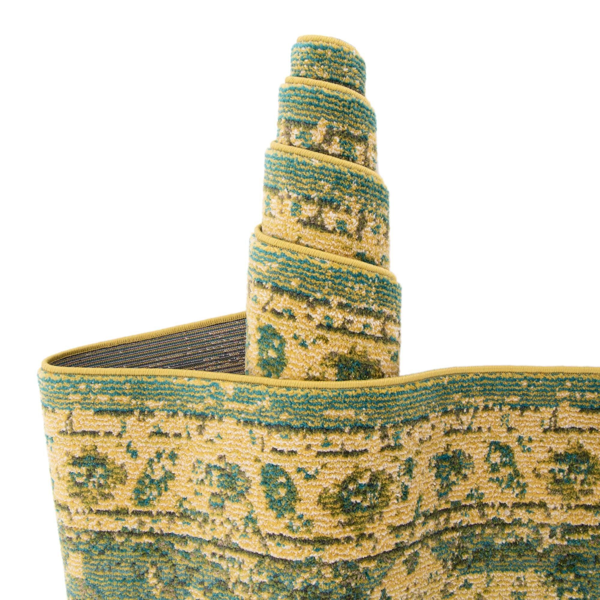 Primary color is Green. Colors in this rug include: Green, Cream, Gold, Gray, Olive.