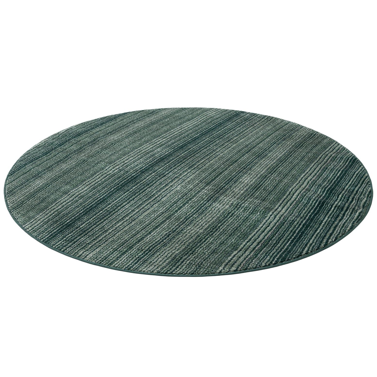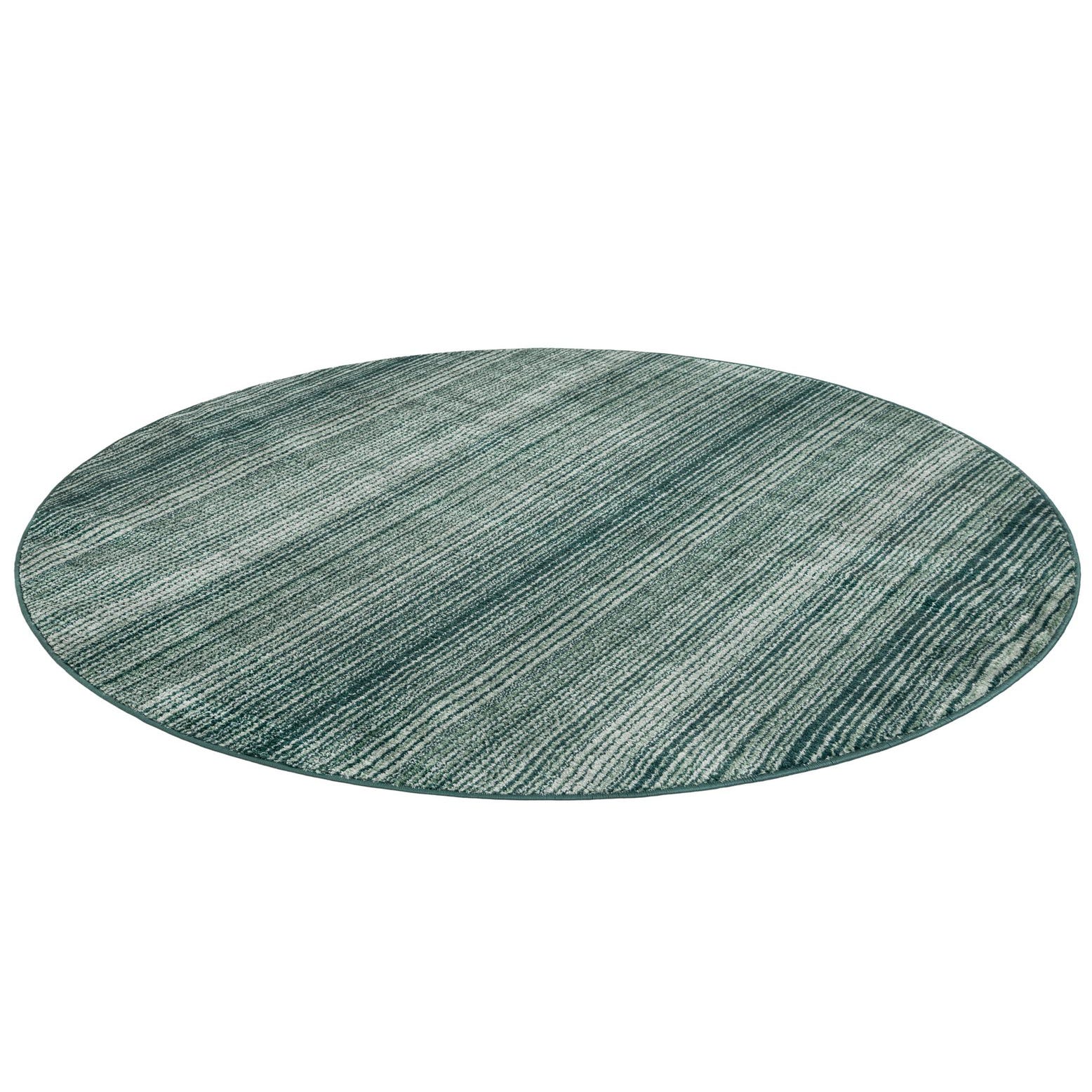 A round rug with a narrow, linear stripe motif woven across a green background. Bands of olive and light green thread their way through the face, creating subtle vertical striping that reads both modern and relaxed. Machine-made from polypropylene, the low, dense pile has a slightly ribbed hand that feels smooth underfoot and keeps the pattern looking tidy and consistent.
