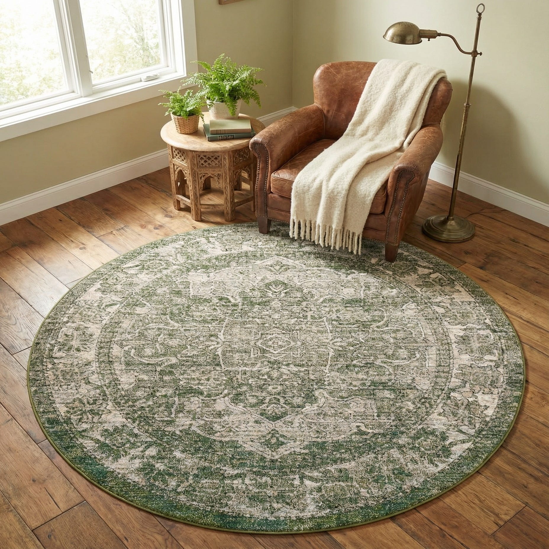 Place this round rug under a circular dining table to define the meal area, or use it to anchor a cozy seating vignette in a living room or bedroom. It pairs naturally with warm wood furniture, matte black metal accents, and neutral linens; navy or deep blue upholstery will pick up the cooler tones, while indoor plants enhance the green background. The overall look complements traditional, transitional, and modern farmhouse interiors that benefit from a touch of vintage pattern without heavy texture.