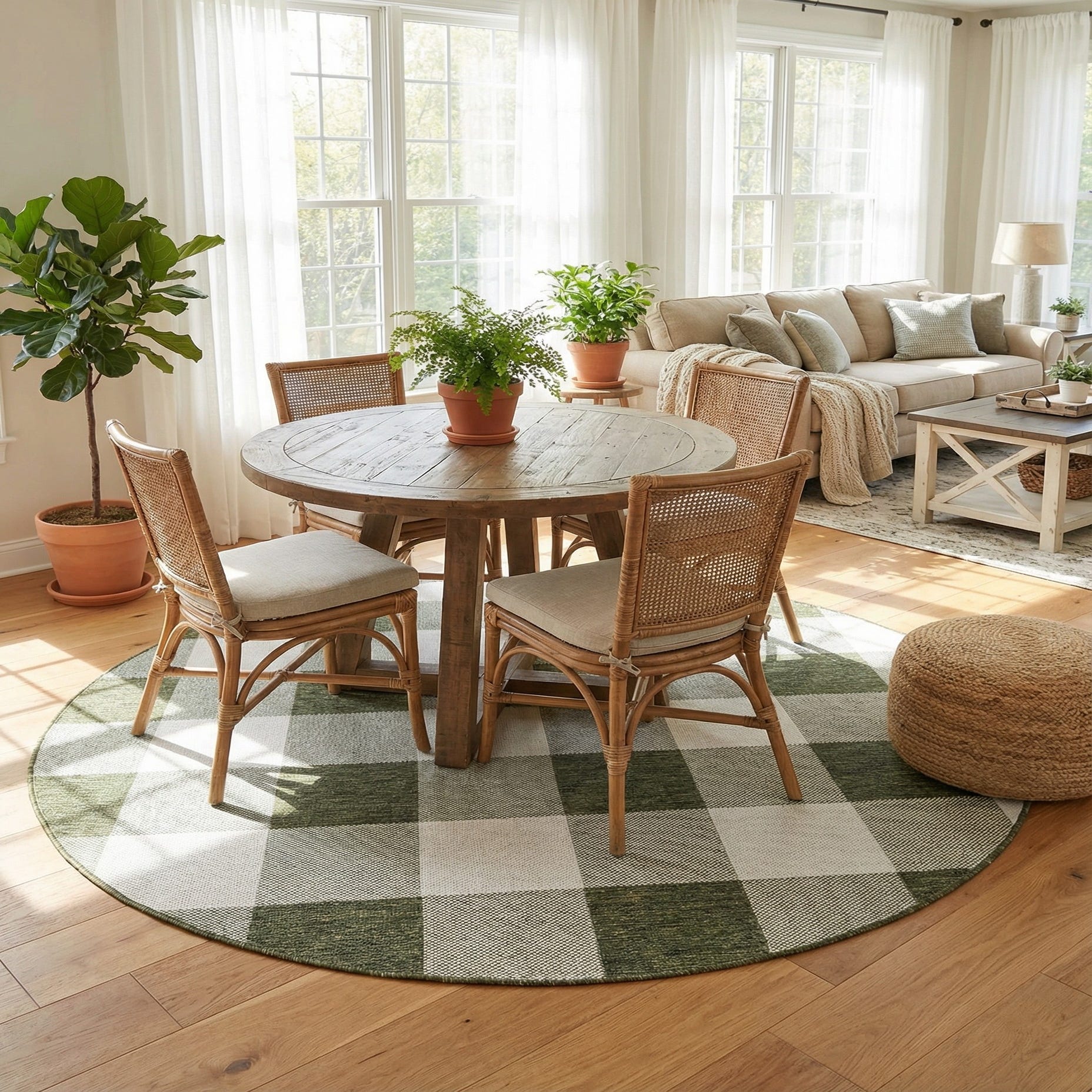 A 6' round green and white checkered flatweave rug, ideal for an indoor or outdoor patio space.