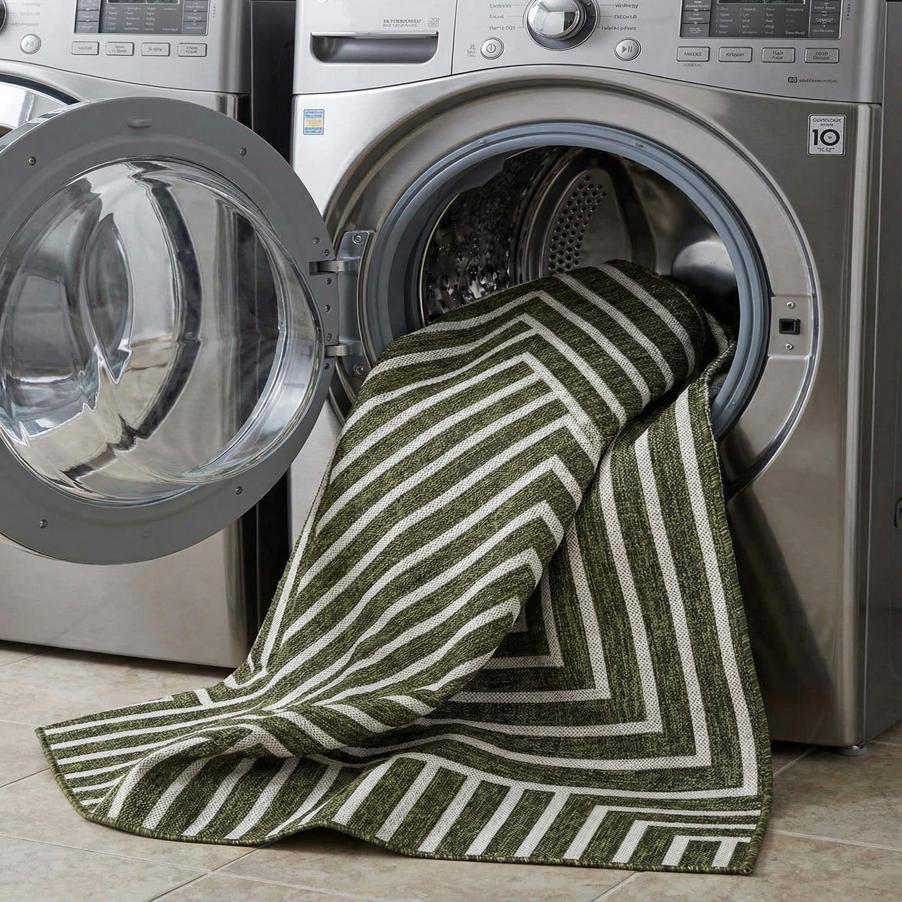 A 6' 0 x 6' 0 round green and white modern abstract rug featuring a bold geometric pattern of concentric squares and lines, suitable for indoor or outdoor use.