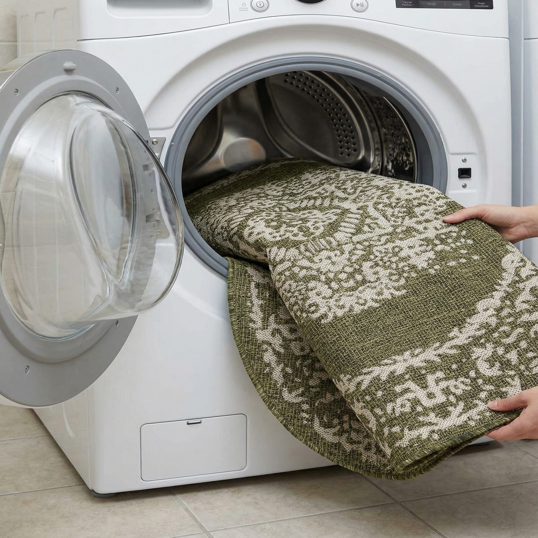 Machine-made from 100% polypropylene, the weave has a low, flat texture that feels sturdy underfoot and lays smoothly in outdoor or indoor-transition spaces. Place it beneath a round bistro table on a covered patio, anchor a sunroom seating group, or use it to define an entry or porch sitting area. Pair with natural wood or wicker furniture, stone or concrete surfaces, and leafy plants to enhance the green tones, while gray pillows or metal accents will pick up the pattern’s neutral highlights.