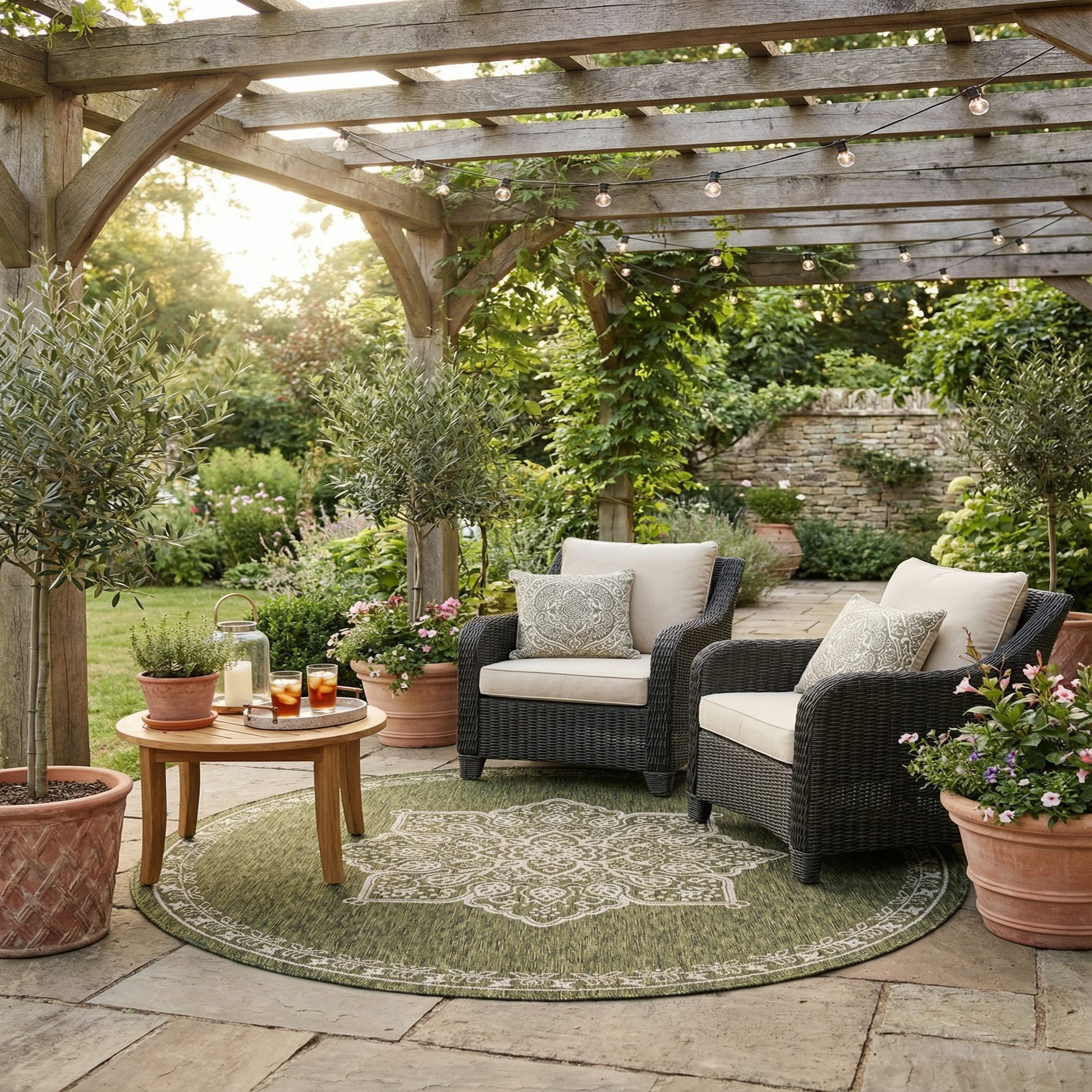 The round shape and classic pattern make this rug a strong choice for covered patios, a bistro nook, or a sunroom where durable materials matter. Pair it with natural rattan or teak seating and neutral cushions for relaxed outdoor living, or use it under a round dining table in a transitional interior with gray or wood-toned accents to tie the room together.