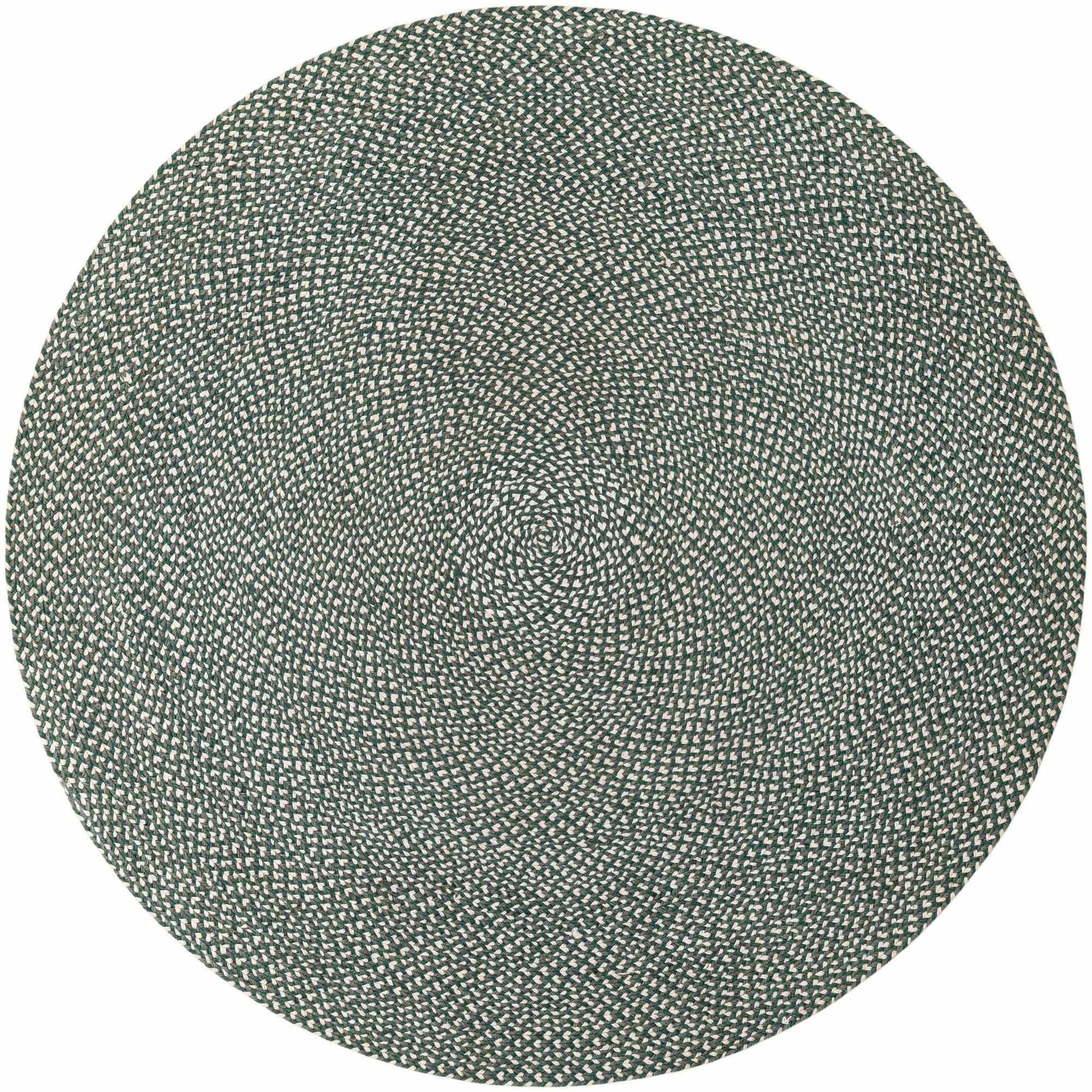 Hand-braided from 100% jute, this round rug showcases tight concentric braids that form a subtle two-tone pattern across a green background. Interwoven ivory and gray fibers create a soft, salt-and-pepper effect that adds visual depth without overwhelming the space. The braided construction gives the surface a firm, low-profile texture with the natural, slightly coarse warmth you expect from jute underfoot.