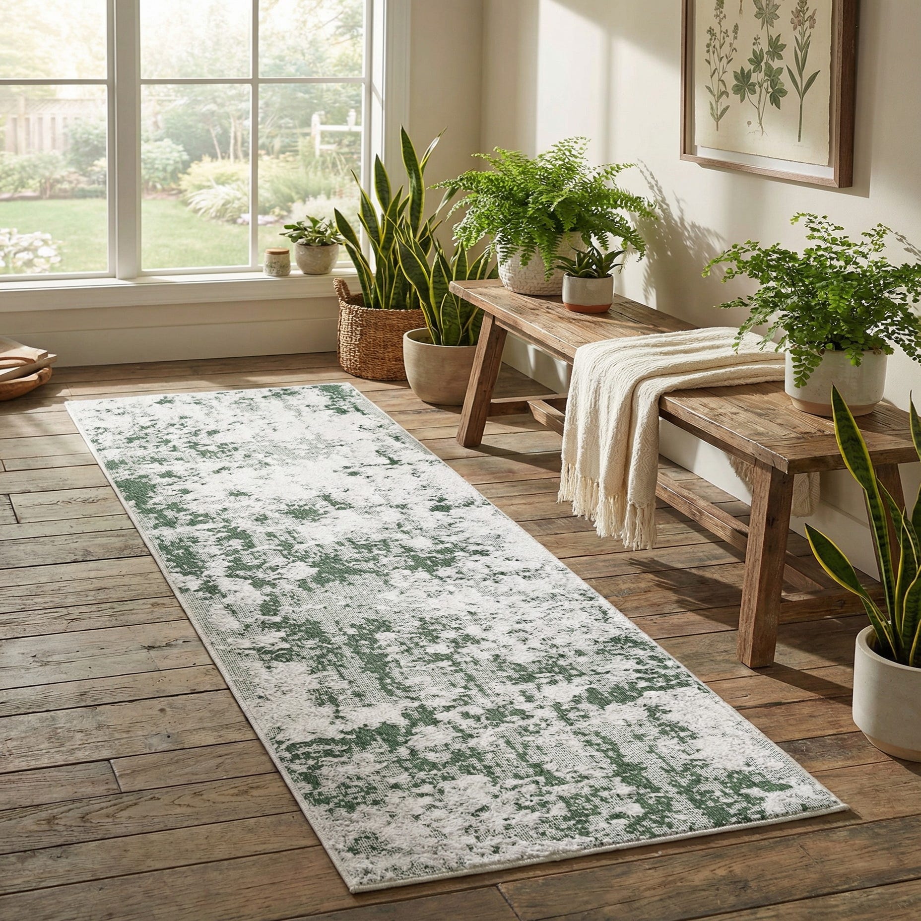 This runner works well in narrow spaces that need visual interest, such as hallways, kitchens, or alongside a bed, and complements neutral schemes as easily as rooms with botanical or mid-century accents. Pair it with light wood furniture and matte brass hardware for a Scandinavian-meets-modern vibe, or use it to soften ceramic or concrete floors in an urban loft. The colorway brings a fresh, natural touch that coordinates with ivory linens, deep green upholstery, and woven accessories.
