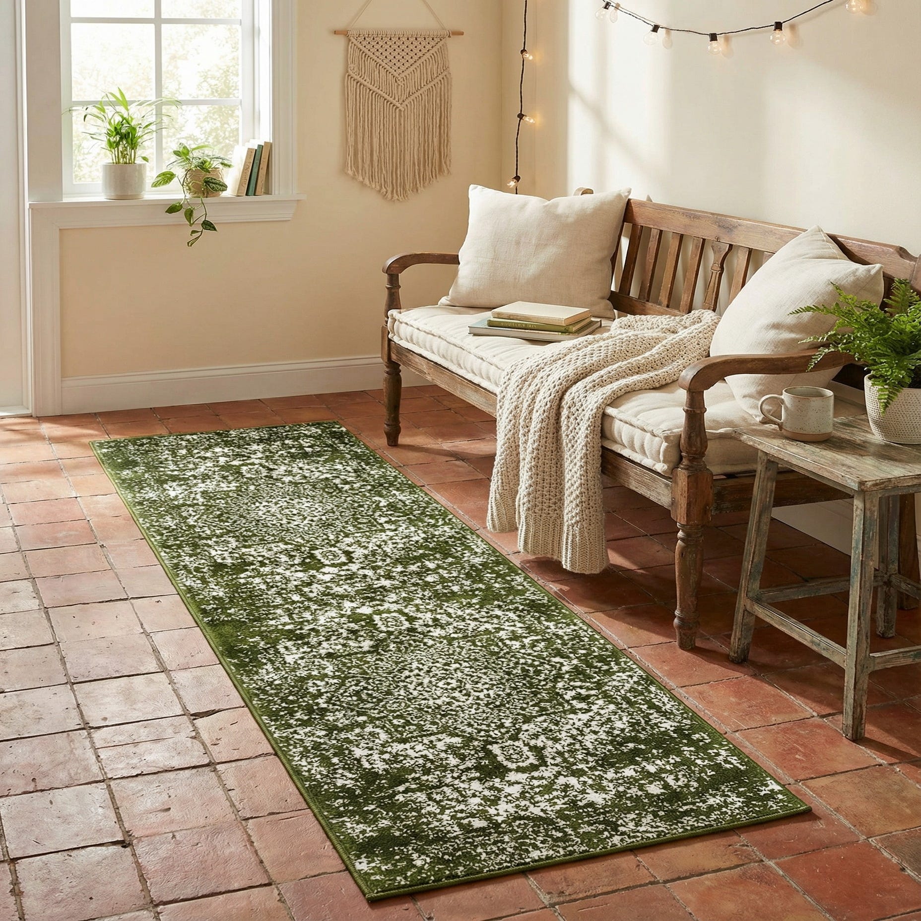 Primary color is Green. Colors in this rug include: Green, Ivory.