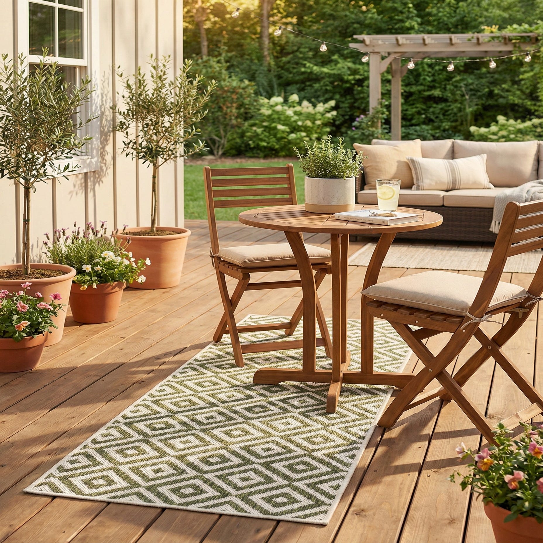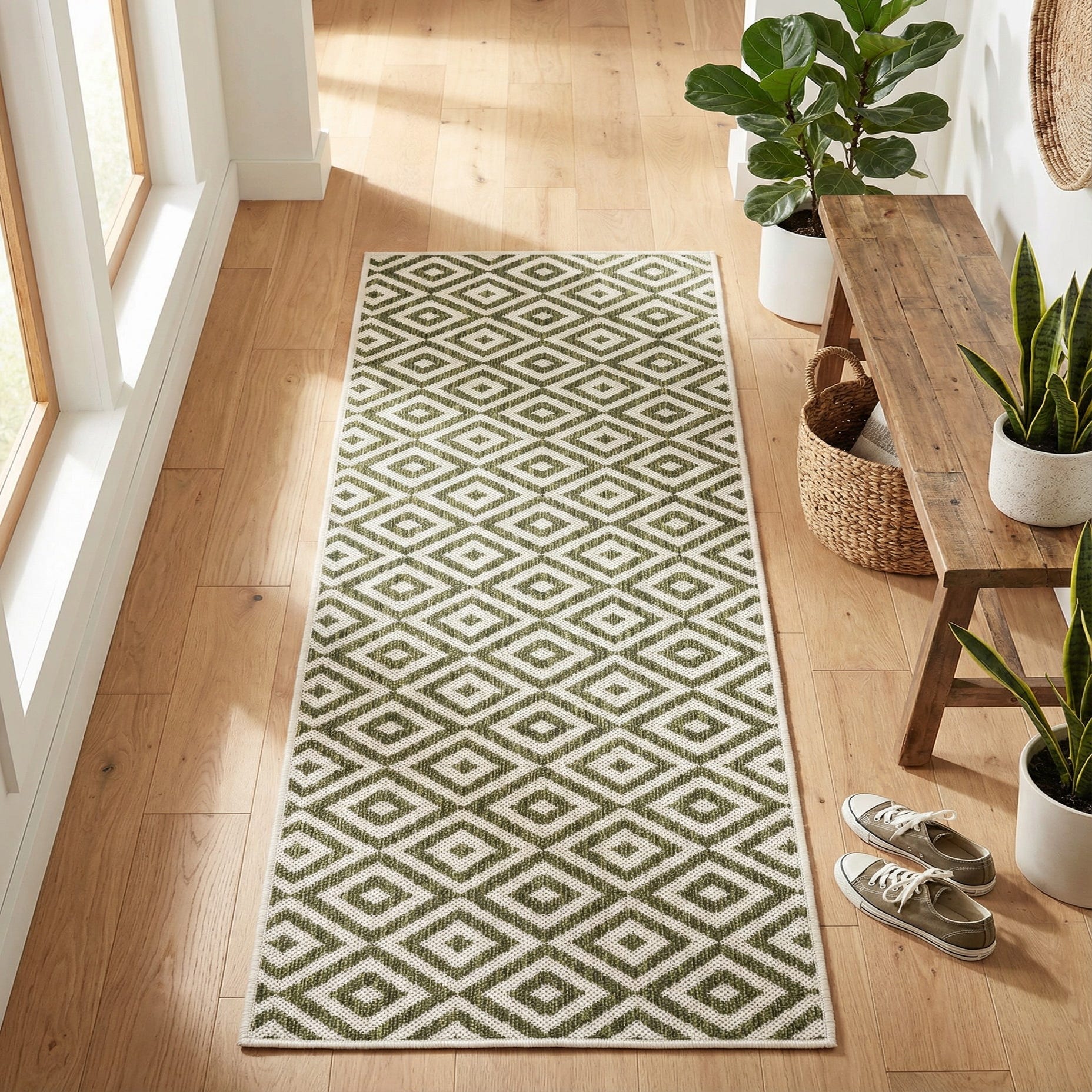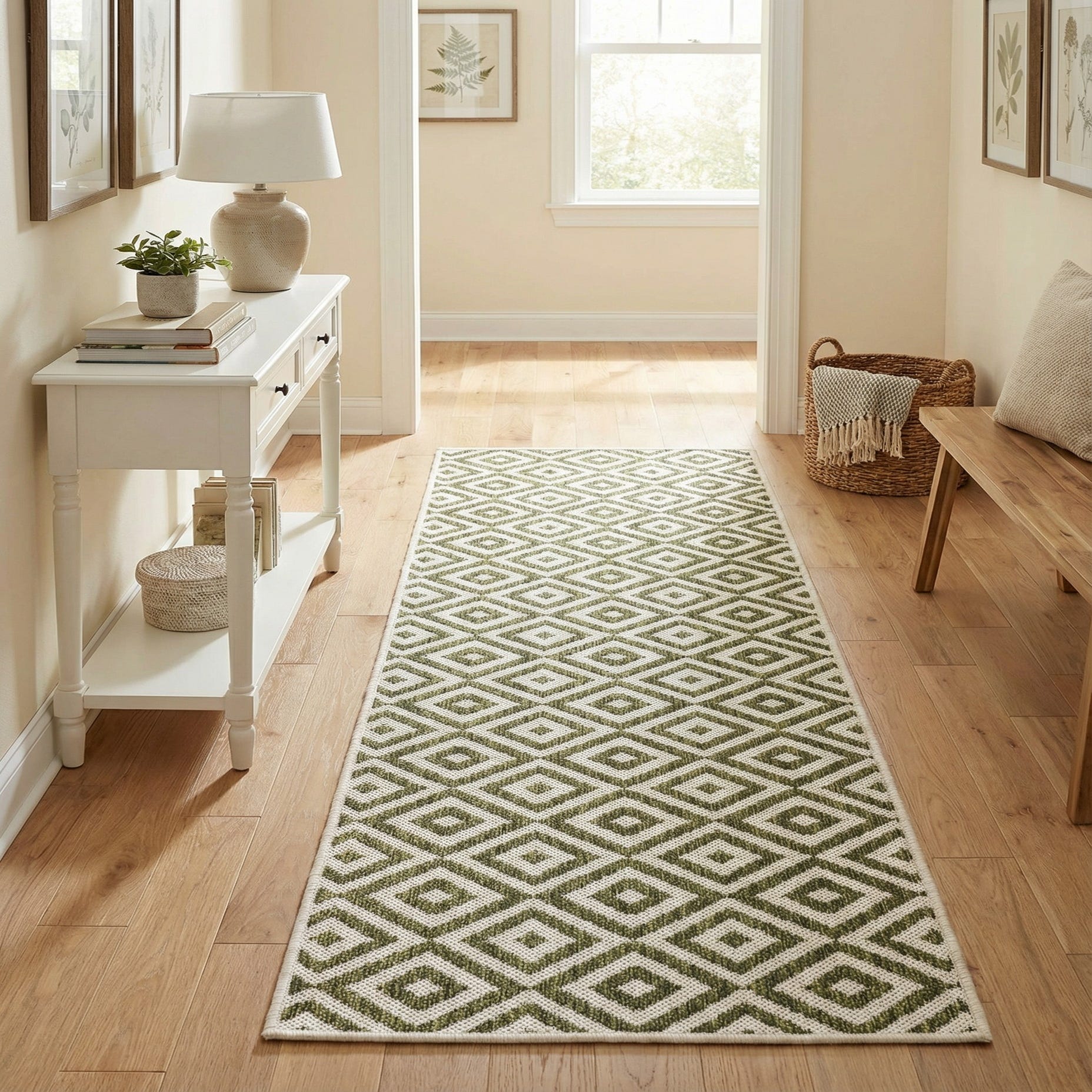 Made for outdoor settings, this long, narrow runner works well in entryways, hallways, along a kitchen island, or on a covered porch. Pair it with natural wood tones, rattan or wicker seating, and leafy greenery for a relaxed, garden-inspired feel, or use it to add a graphic layer to modern farmhouse and mid-century interiors. The green-and-ivory palette also complements neutral furnishings and botanical prints, making it easy to anchor a walkway or bring pattern into narrow spaces.