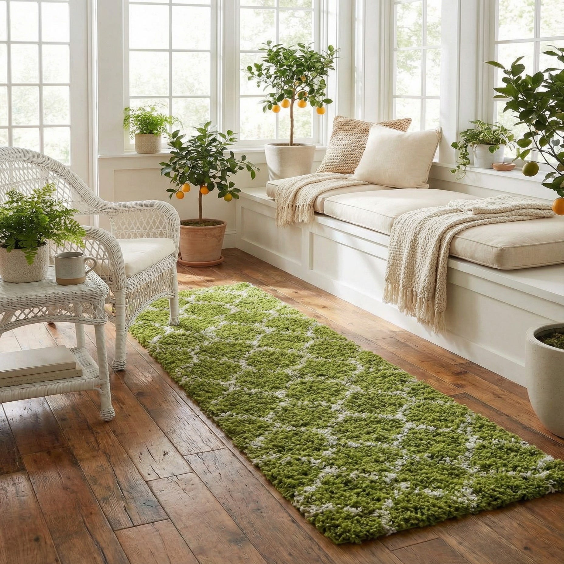 A lively green field is softened by a plush shag pile while crisp ivory lines form a repeating lattice of diamonds across the surface. The combination of geometric pattern and deep, textured pile gives the runner a relaxed, contemporary look that balances structure with softness. Machine-made from 100% polypropylene, the yarn has a dense, cushioned feel underfoot and a pronounced shag appearance that adds visual depth.