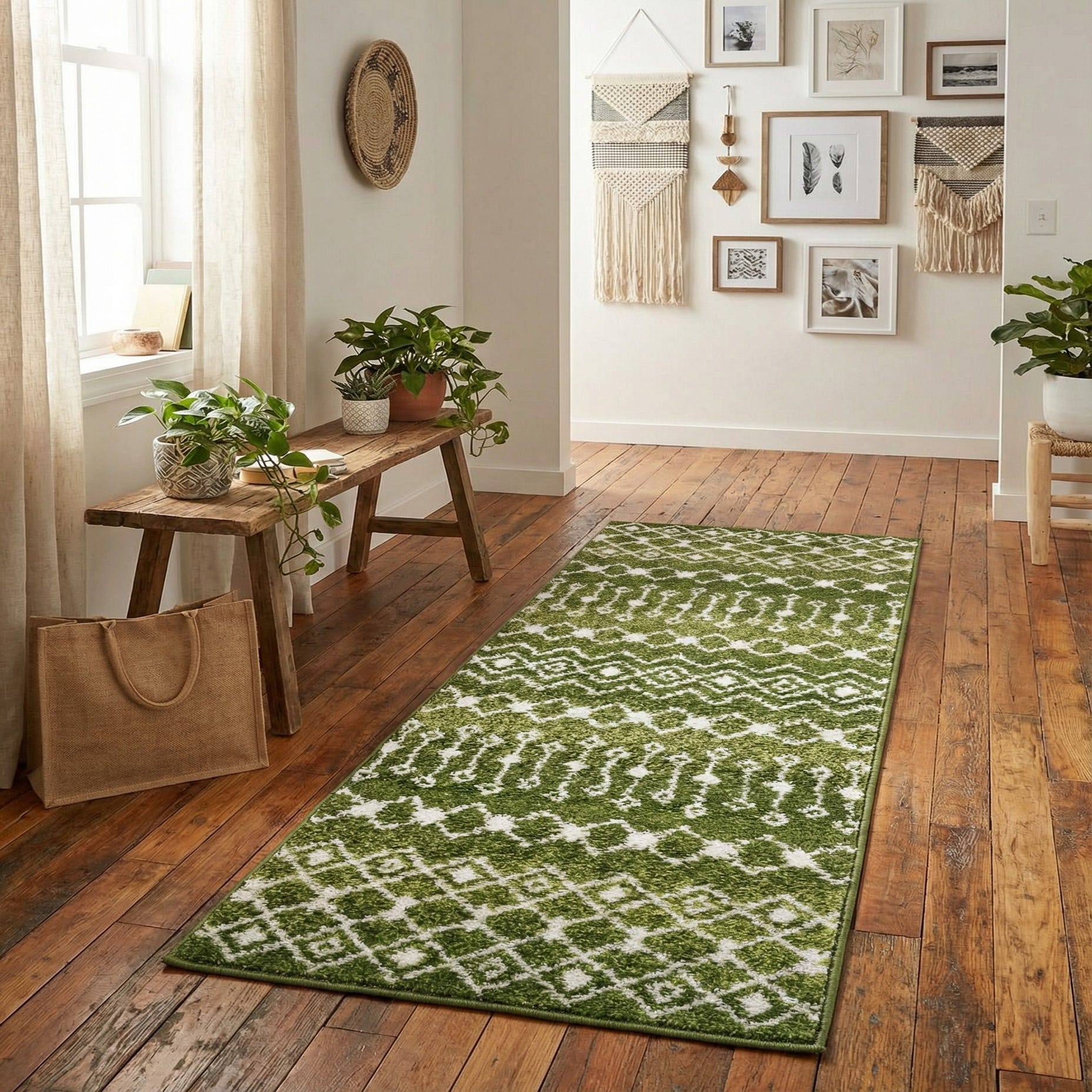 This runner works well in narrow or transitional spaces — think entryways, hallways, kitchen aisles, or alongside a bed — where it can introduce color and pattern without overwhelming the room. It pairs naturally with warm wood tones, white or cream cabinetry, rattan and woven accents, and neutral upholstery, fitting modern farmhouse, boho, and transitional interiors that favor layered textures and modest geometric patterning.