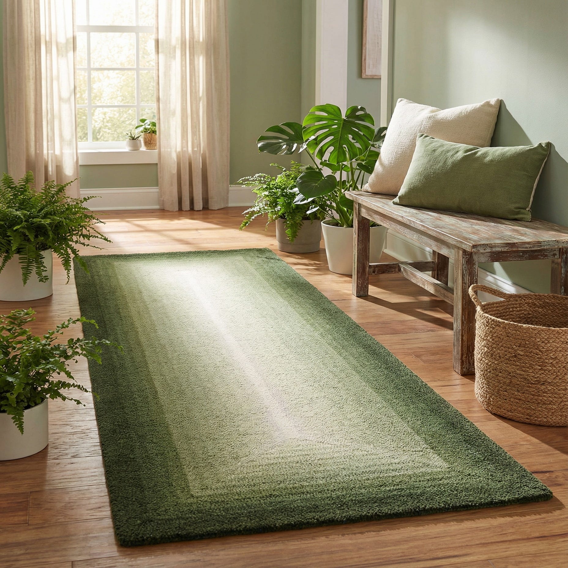 A 6 ft runner rug with an ombre gradient pattern, transitioning from dark green at the edges to light green in the center.