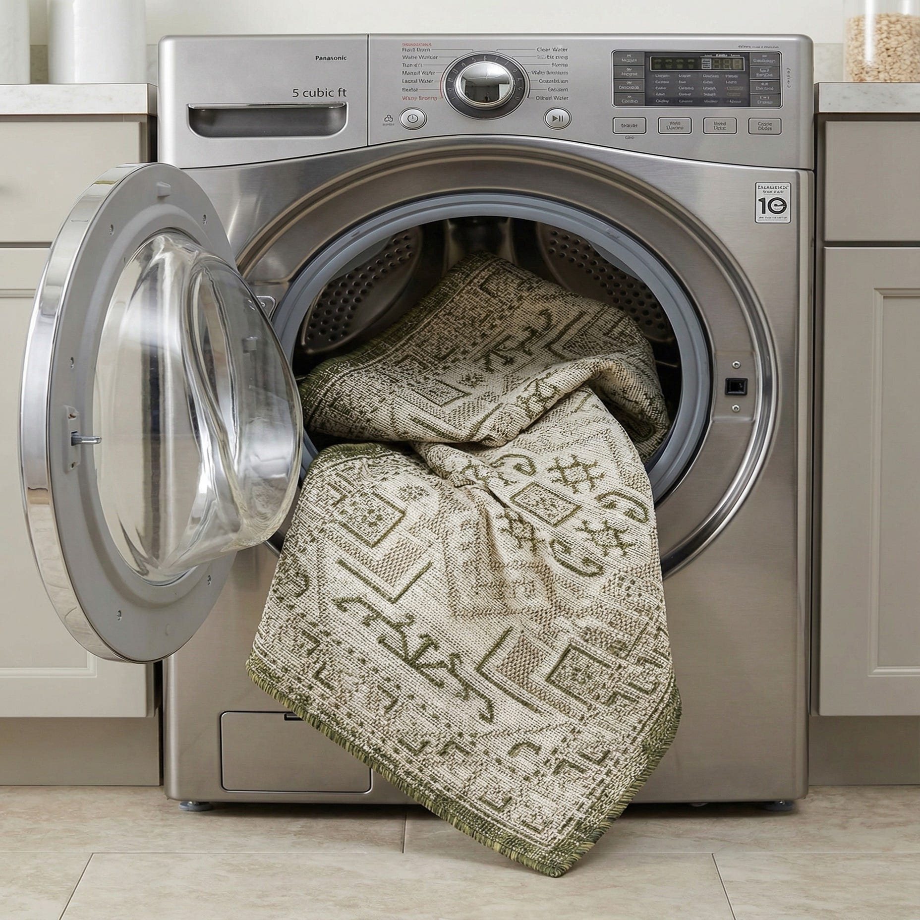 This runner, with its green and ivory palette, seamlessly integrates into a variety of decor scenarios. Its design is well-suited for contemporary outdoor spaces such as patios, decks, and poolside areas, where it can enhance the natural elements. Alternatively, in indoor settings, it would complement modern, minimalist, or Scandinavian-style decors, either as a statement piece in a living area or a welcoming accent in an entryway.