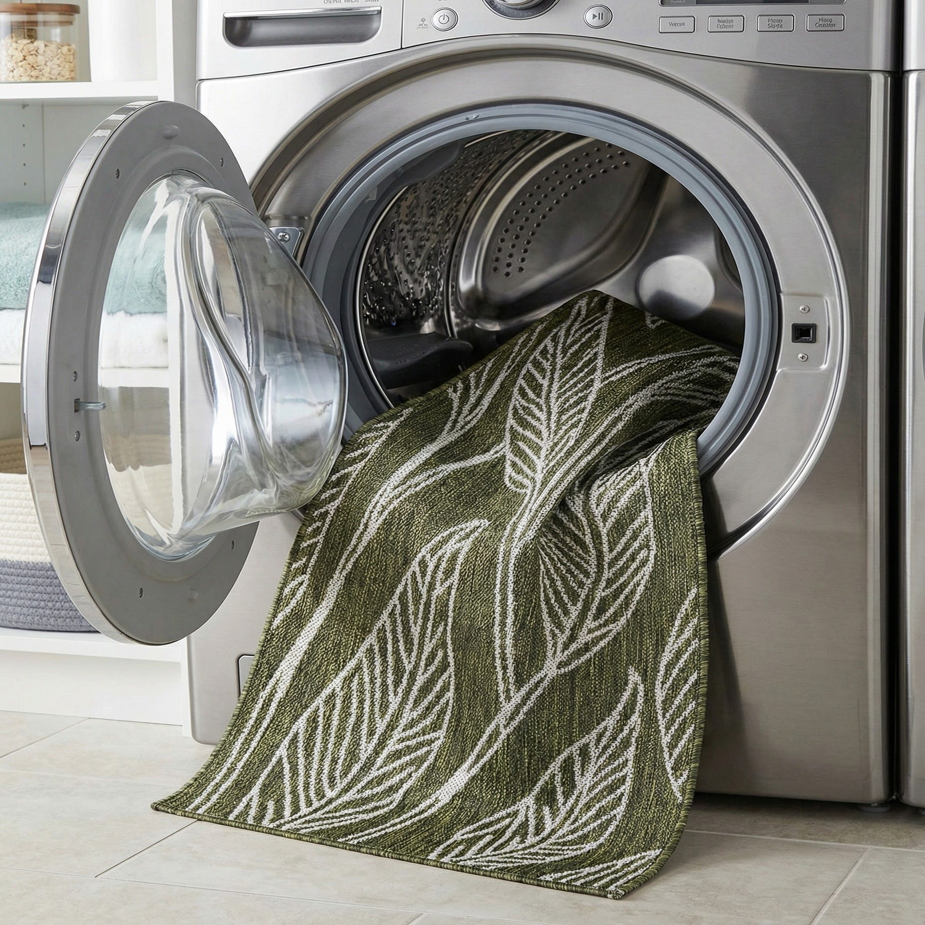 A 6 ft runner rug with a modern botanical pattern of white leaves on a textured green background, suitable for indoor/outdoor use.