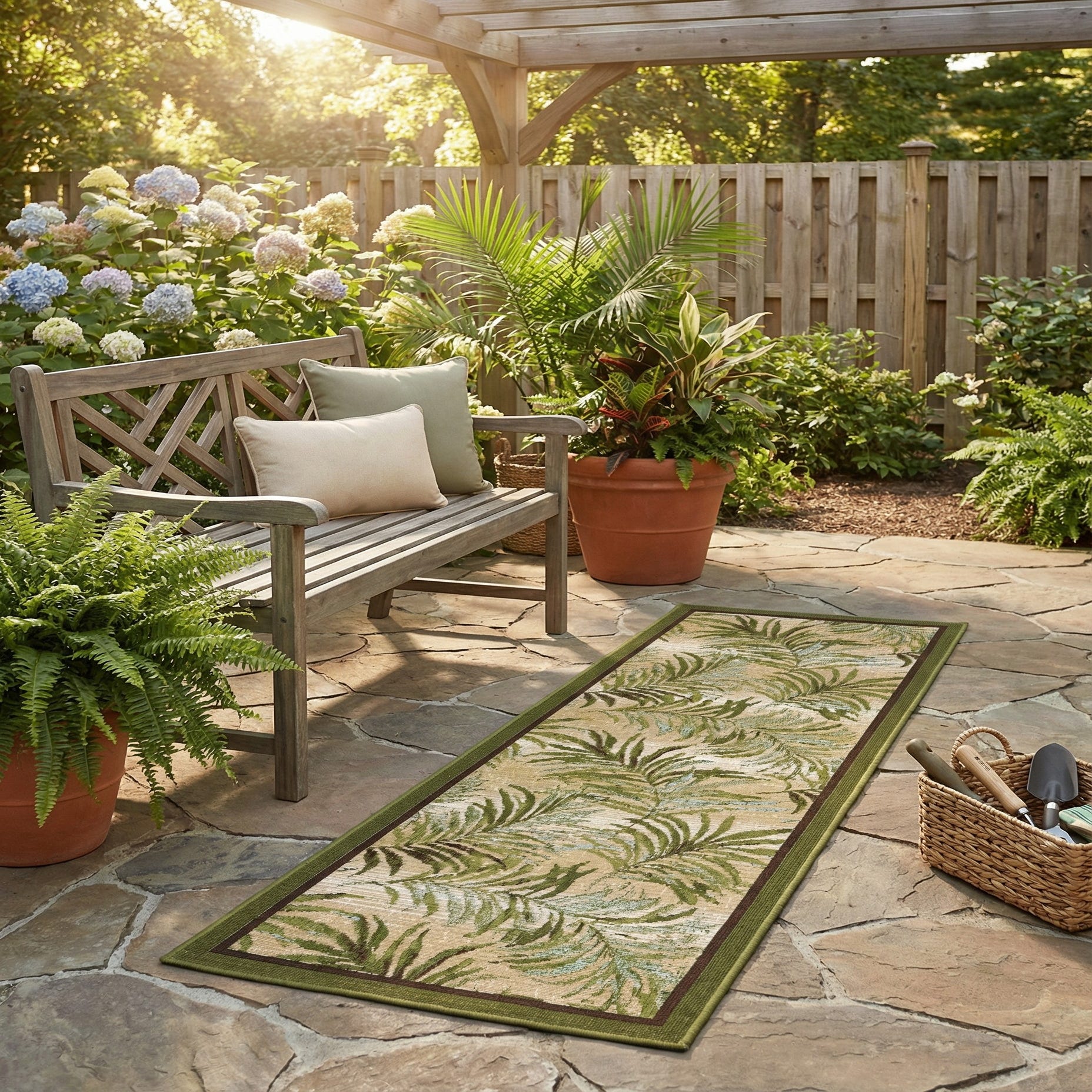 A leafy palm-frond pattern sweeps across a green background in a relaxed, tropical motif. Olive and light-green fronds overlap against beige and ivory accents, with a narrow dark-brown inner border and a solid green outer edge that frame the design. The palette stays grounded in natural tones—green, beige, ivory, light green and olive—so the pattern reads layered without competing colors. Machine made of 75% polypropylene and 25% polyester, the rug has a low-profile, tightly woven surface with a slightly ribbed texture that feels firm underfoot while still providing a bit of tactile interest.
