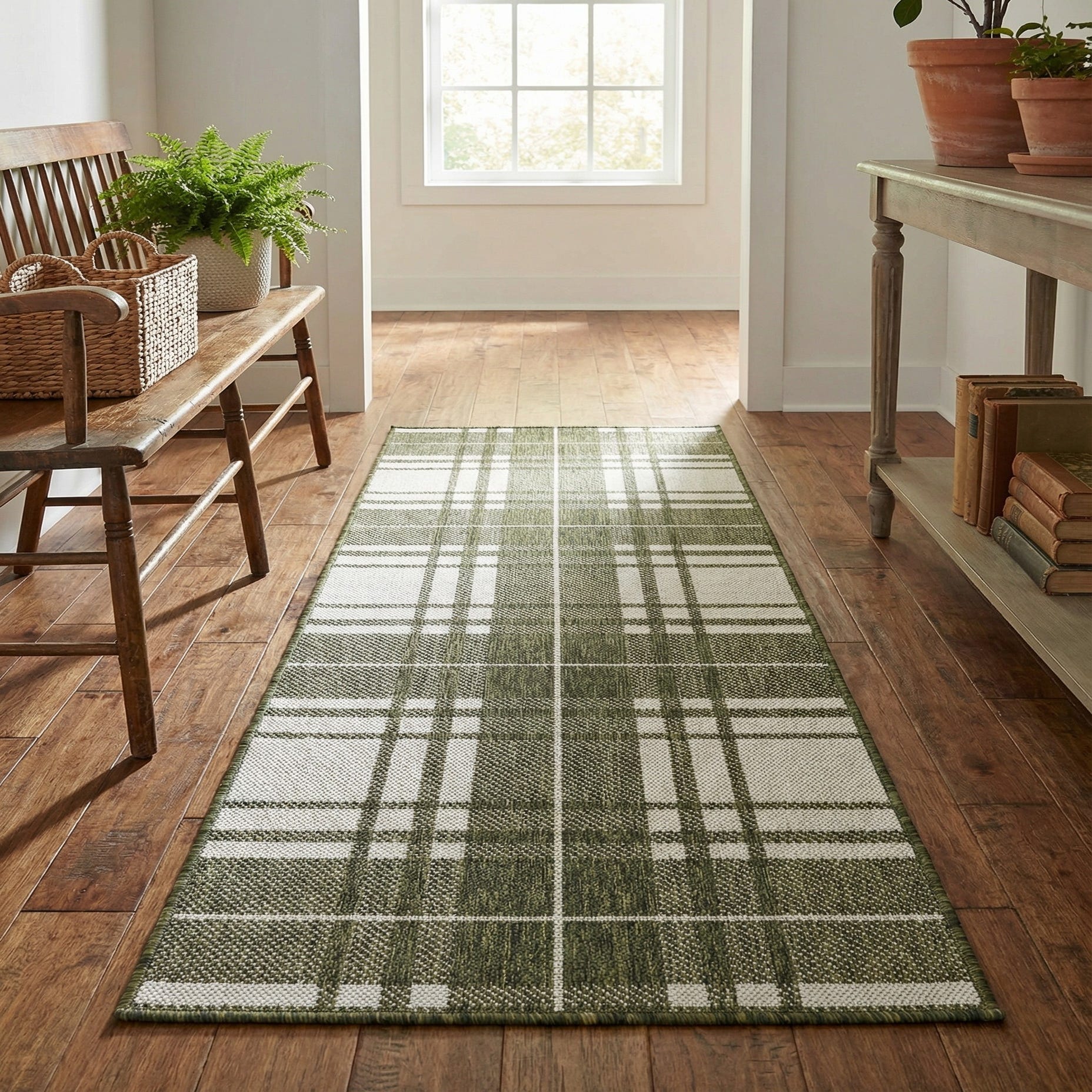 A 6 ft runner rug with a modern green and white plaid pattern, suitable for indoor or outdoor use.