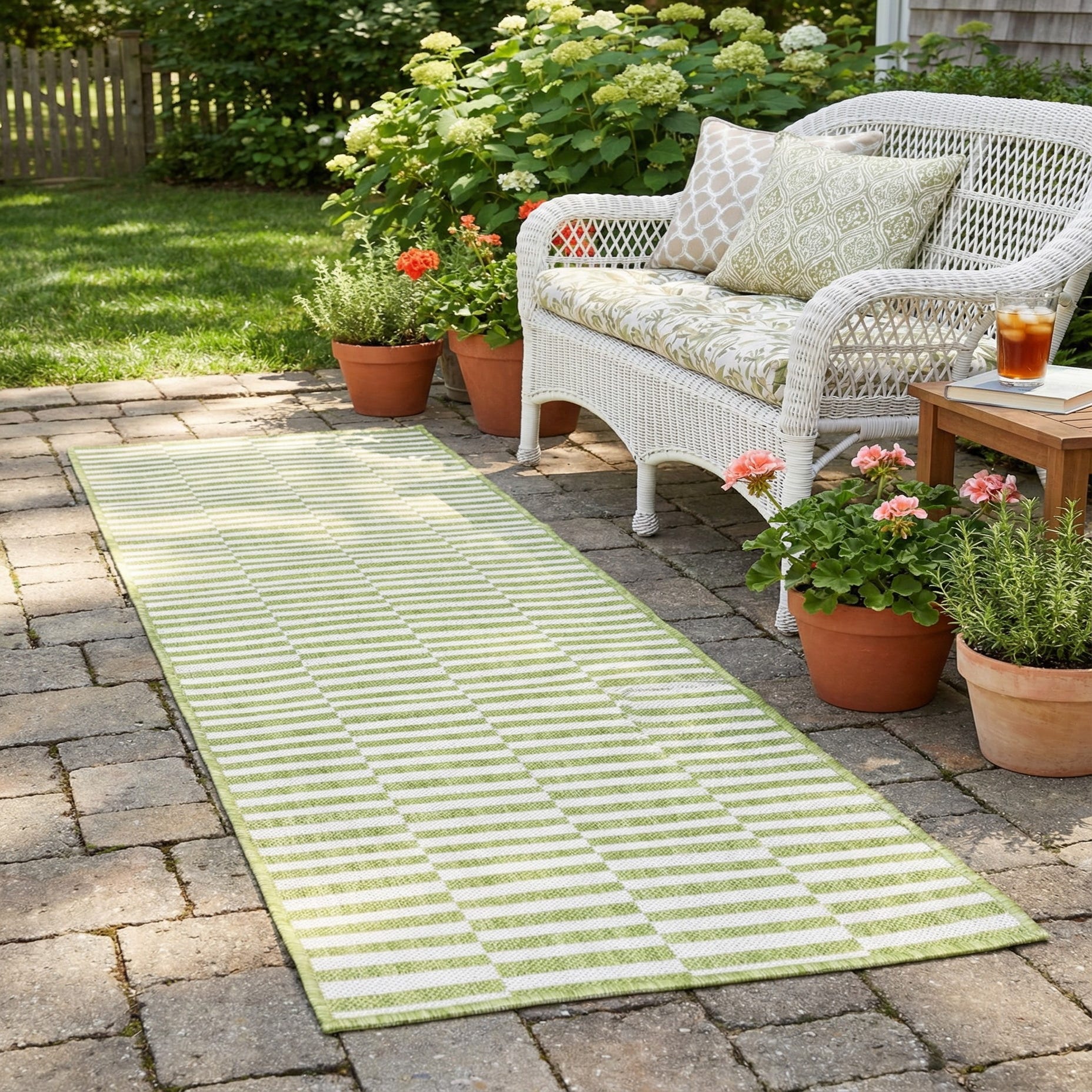The Outdoor Ribbon Collection offers a 6 Ft Runner rug that is a practical and stylish addition to any outdoor or high-traffic indoor area. This rug features a simple yet elegant green and ivory stripe pattern that provides a refreshing and coherent aesthetic. The green background lends a verdant tone to the space, while the ivory stripes offer a crisp contrast, creating an inviting pathway in any setting.