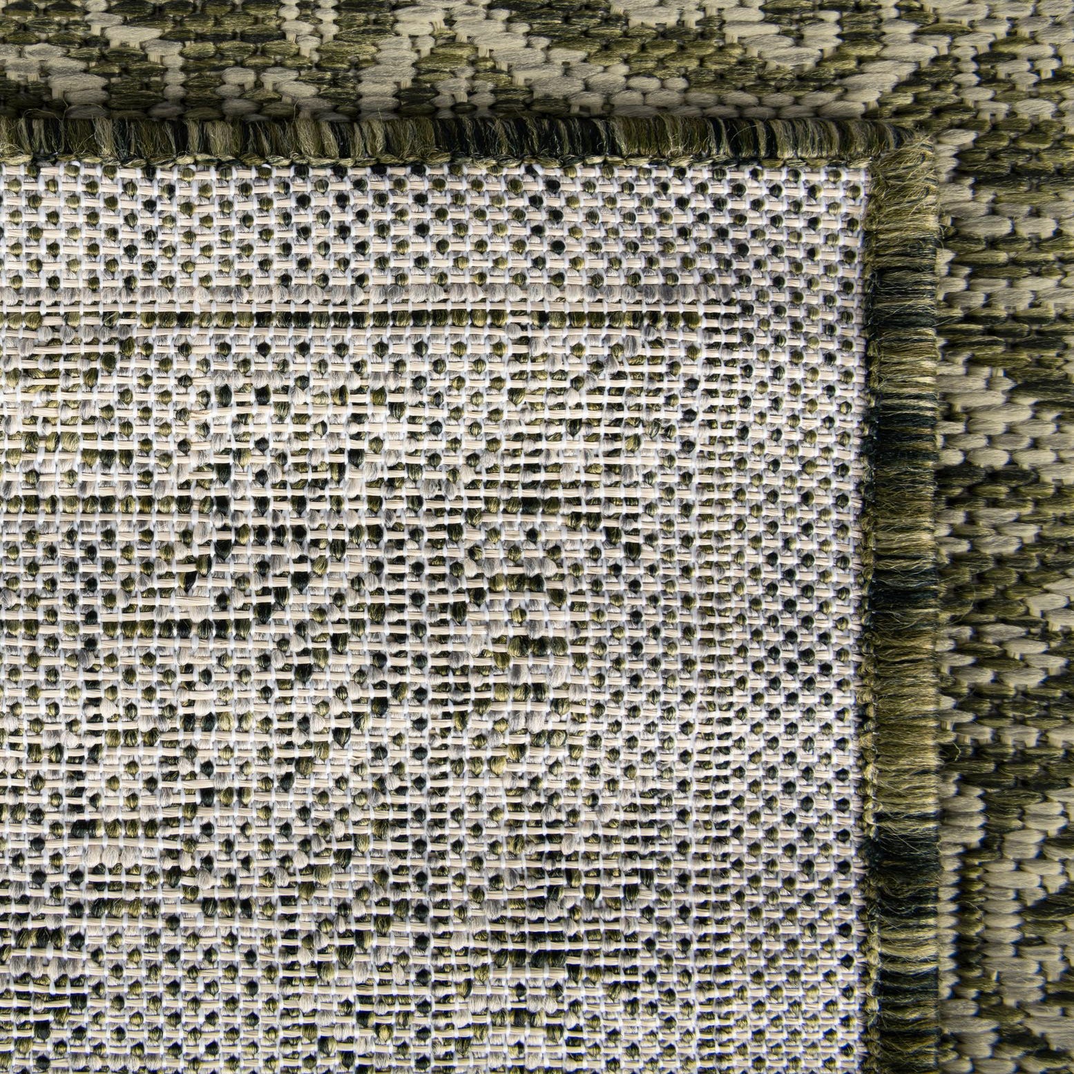 Use this runner to anchor a hallway, entry, or covered porch where a narrow, decorative path is needed. It pairs naturally with warm wood floors, slate or concrete surfaces, and neutral upholstery—think farmhouse, transitional, or traditionally inspired outdoor seating areas. Combine with matte metal accents, woven baskets, and muted linens to highlight the green and gray palette without overpowering surrounding decor.